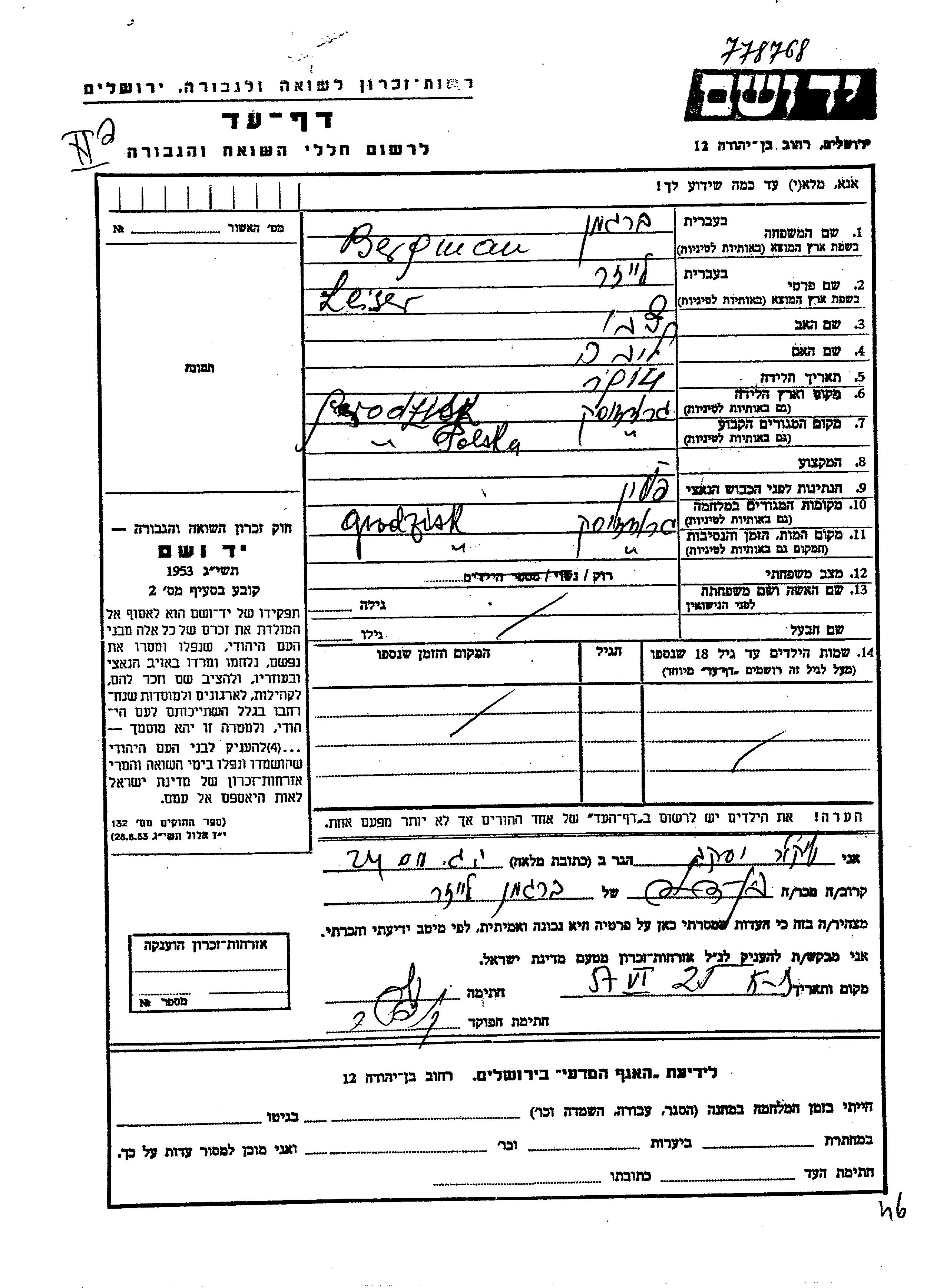 Bergman Leizer 1914 Grodzhisk, Pologne Feuille de témoignage