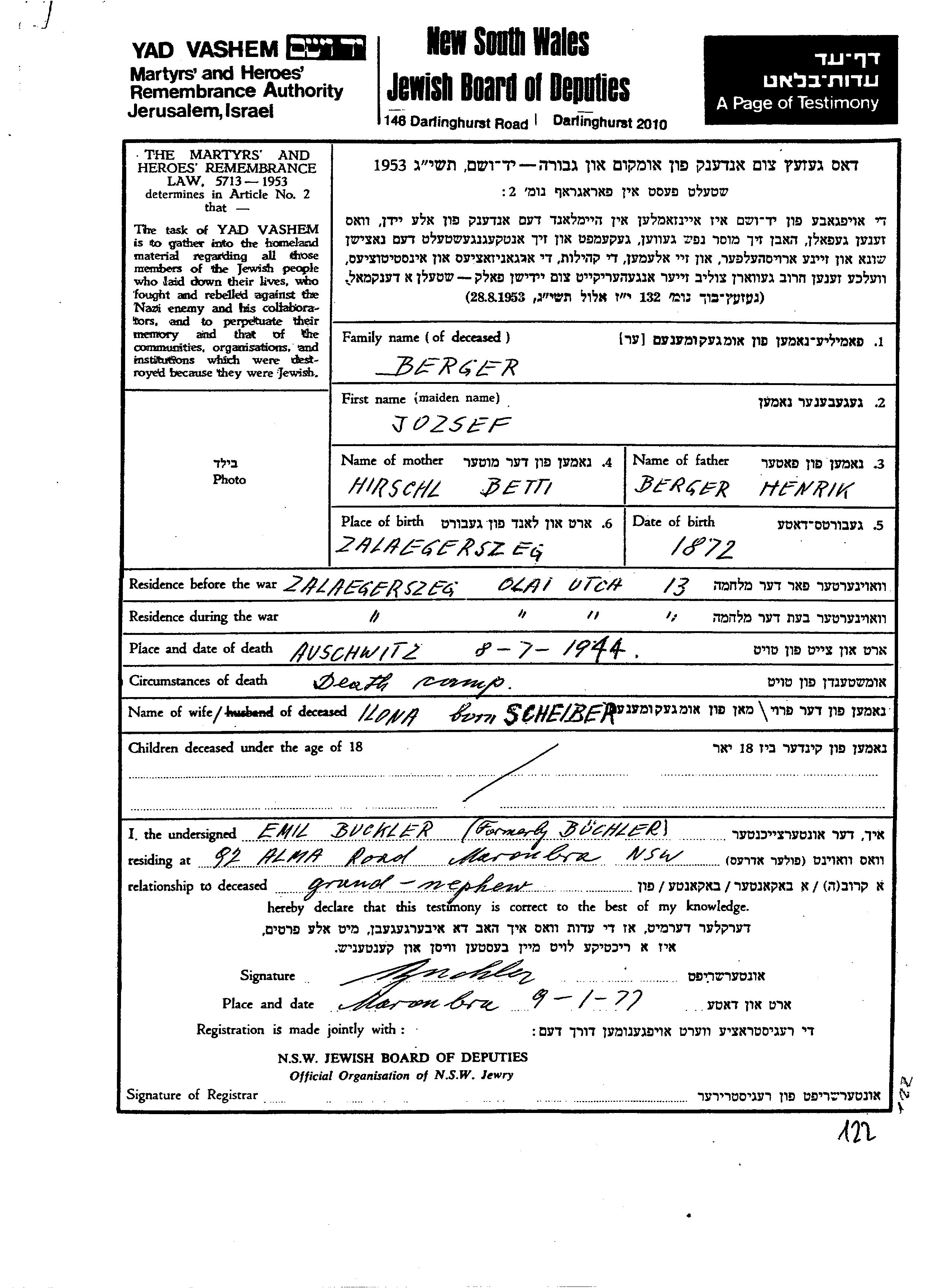 Jozsef Berger est né à Zalaegerszeg, Hongrie en 1872, fils de Henrik et de Betti née Hirschl. Avant la seconde guerre mondiale il vivait à Zalaegerszeg, Hongrie. Au cours de la guerre, il était à Zalaegerszeg, Hongrie.