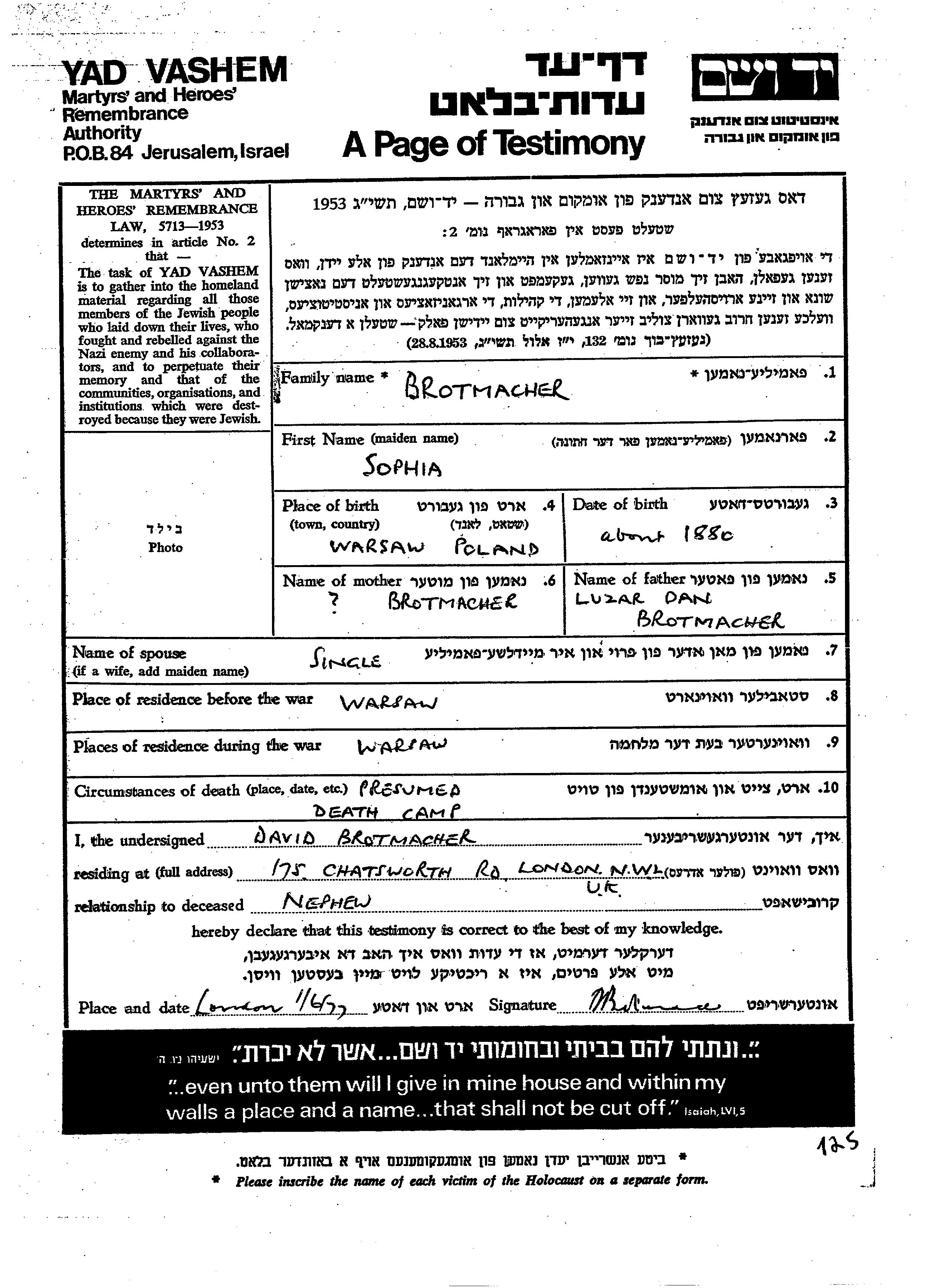 Sophia Brotmacher est née à Warsaw, Pologne en 1880, fille de Luzar Dan. Elle était Célibataire. Avant la seconde guerre mondiale elle vivait à Warsaw, Pologne. Pendant la guerre, elle était à Warsaw, Pologne.