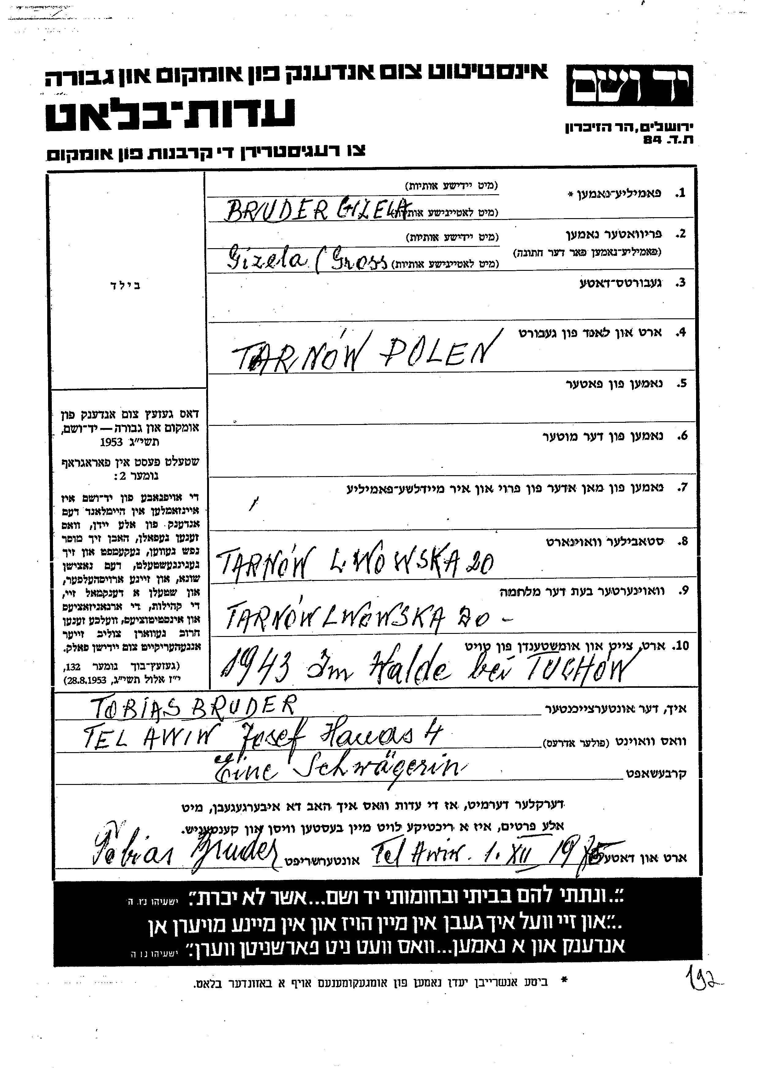 Bruder Gizela Tarnow, Pologne Feuille de témoignage