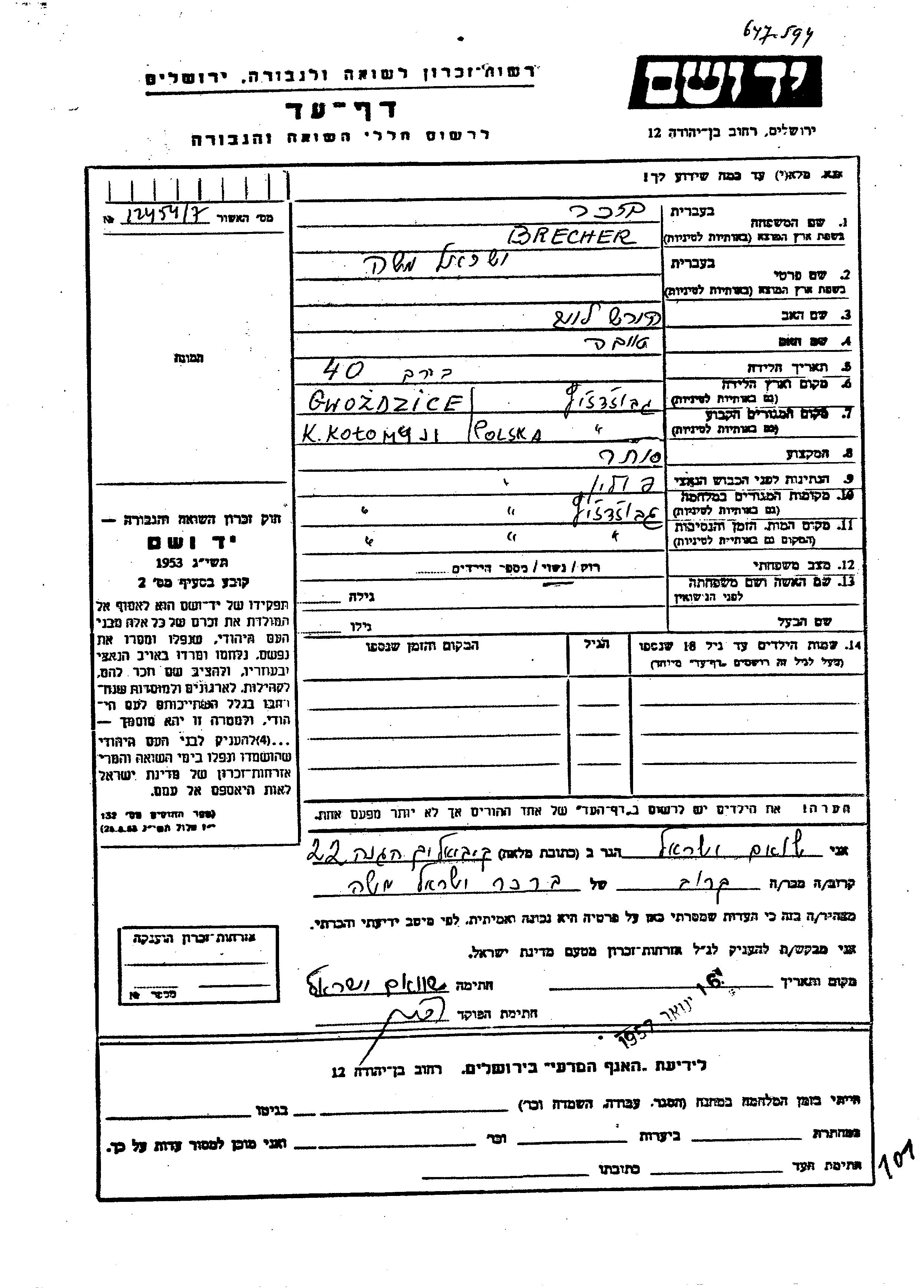 Brekher Yisrael Moshe Gwozdzic, Pologne Feuille de témoignage