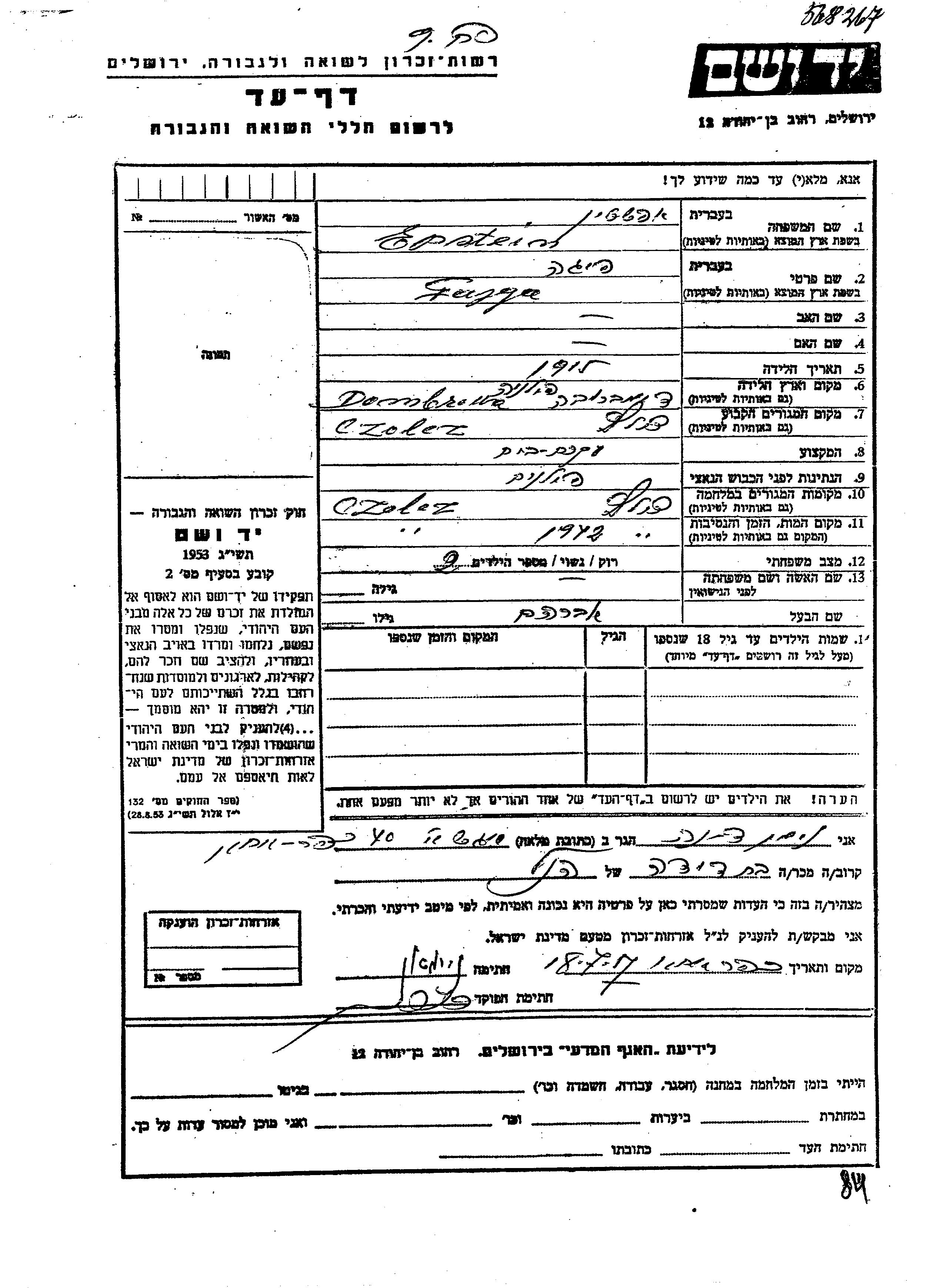Yad Vashem - Pages of Testimony Names Memorial Collection