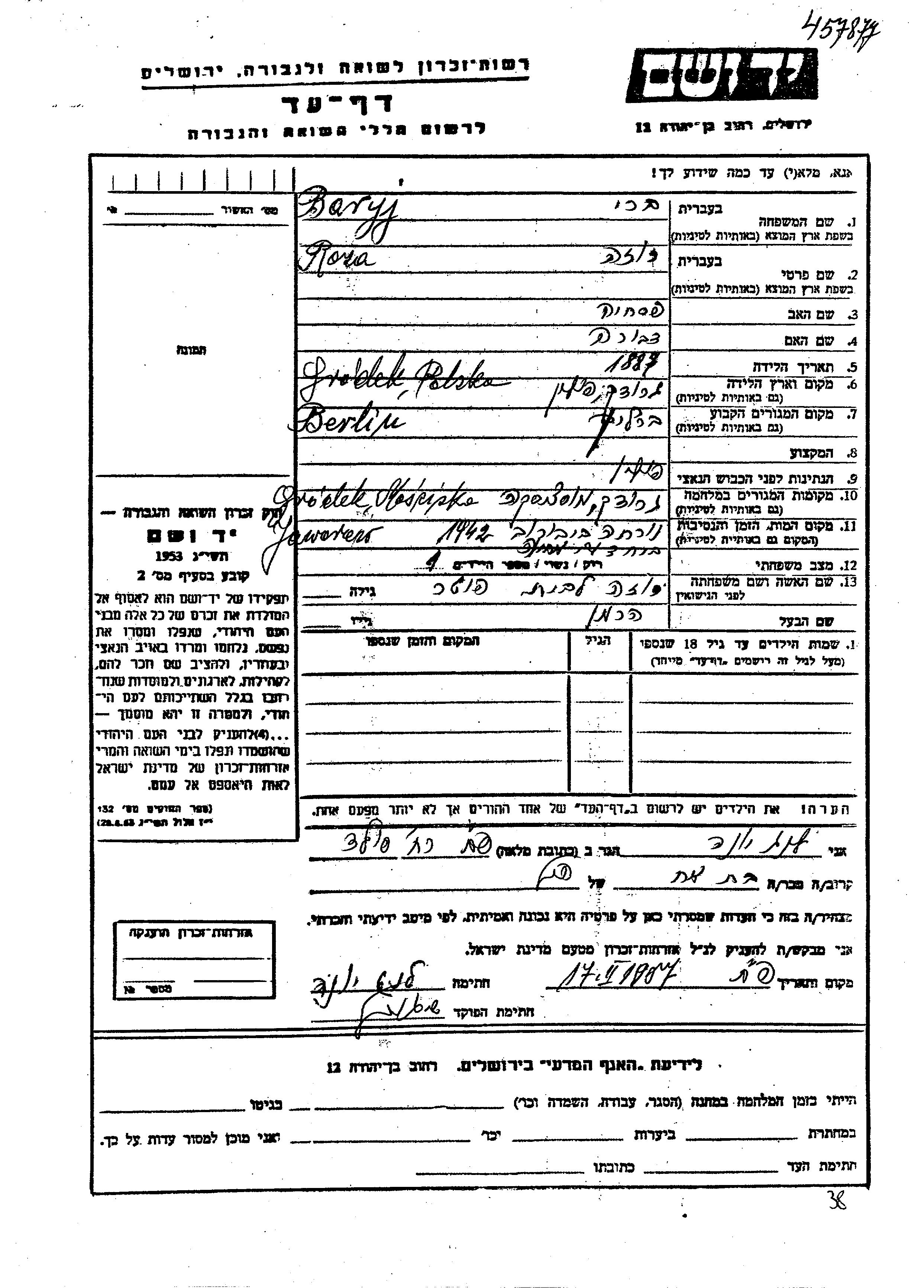 Baryj Roza 1887 Berlin, Allemagne Feuille de témoignage