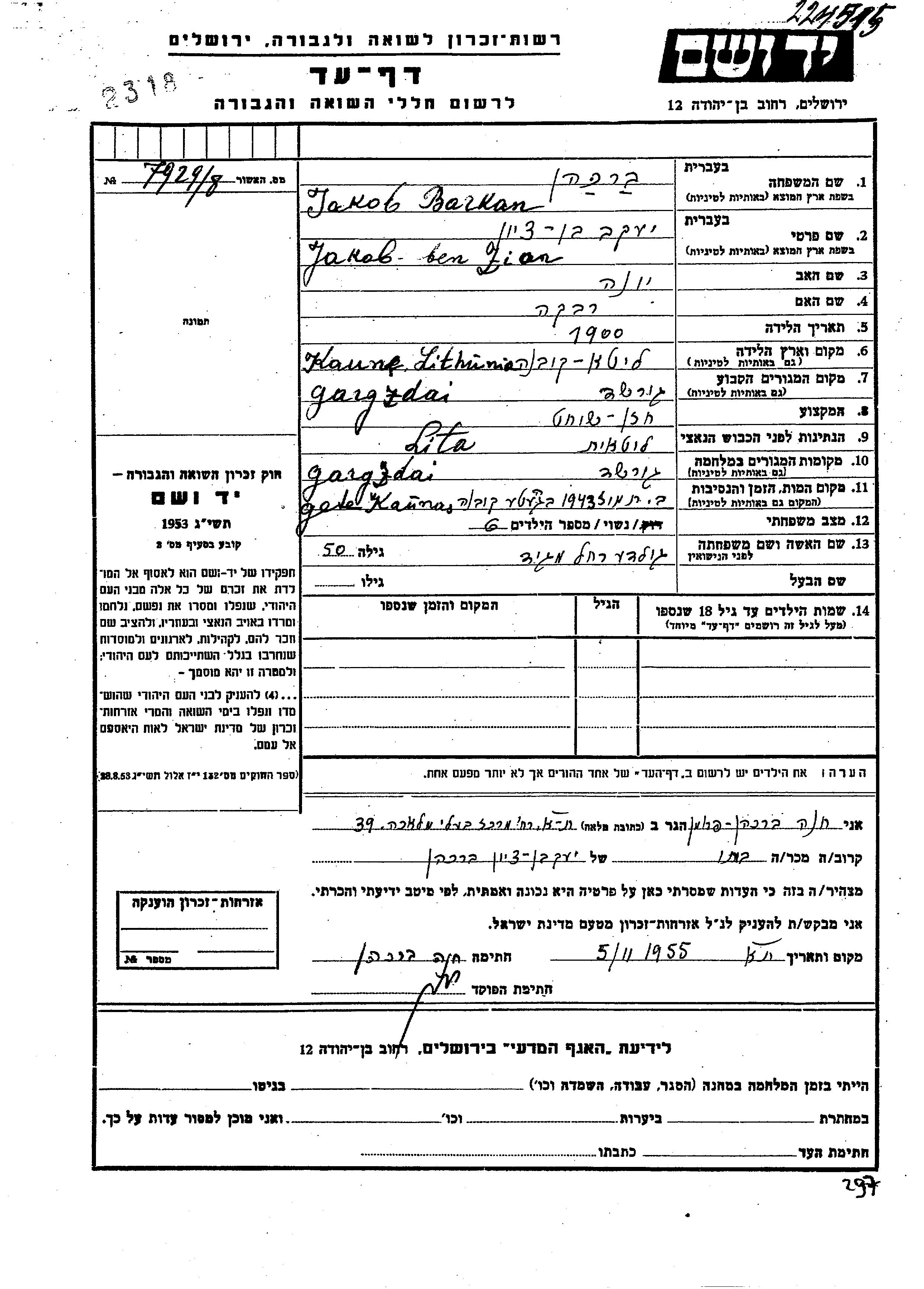 Barkan Yaakov Ben Zion 1900 Gargždai, Lituanie Feuille de témoignage