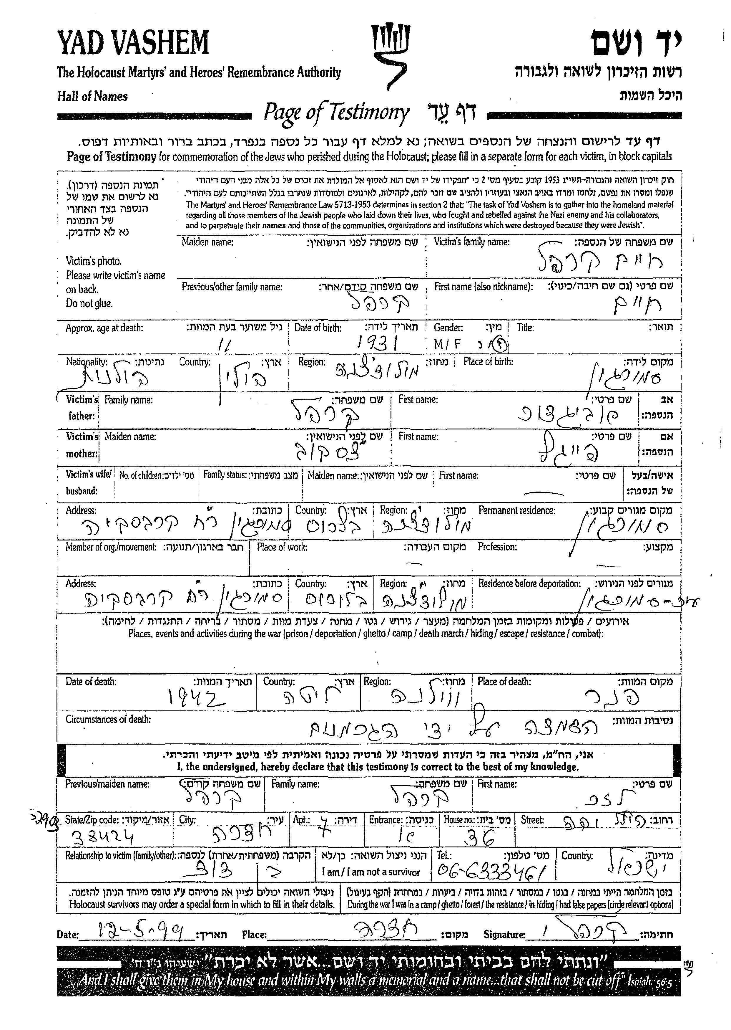 Yad Vashem - Pages of Testimony Names Memorial Collection