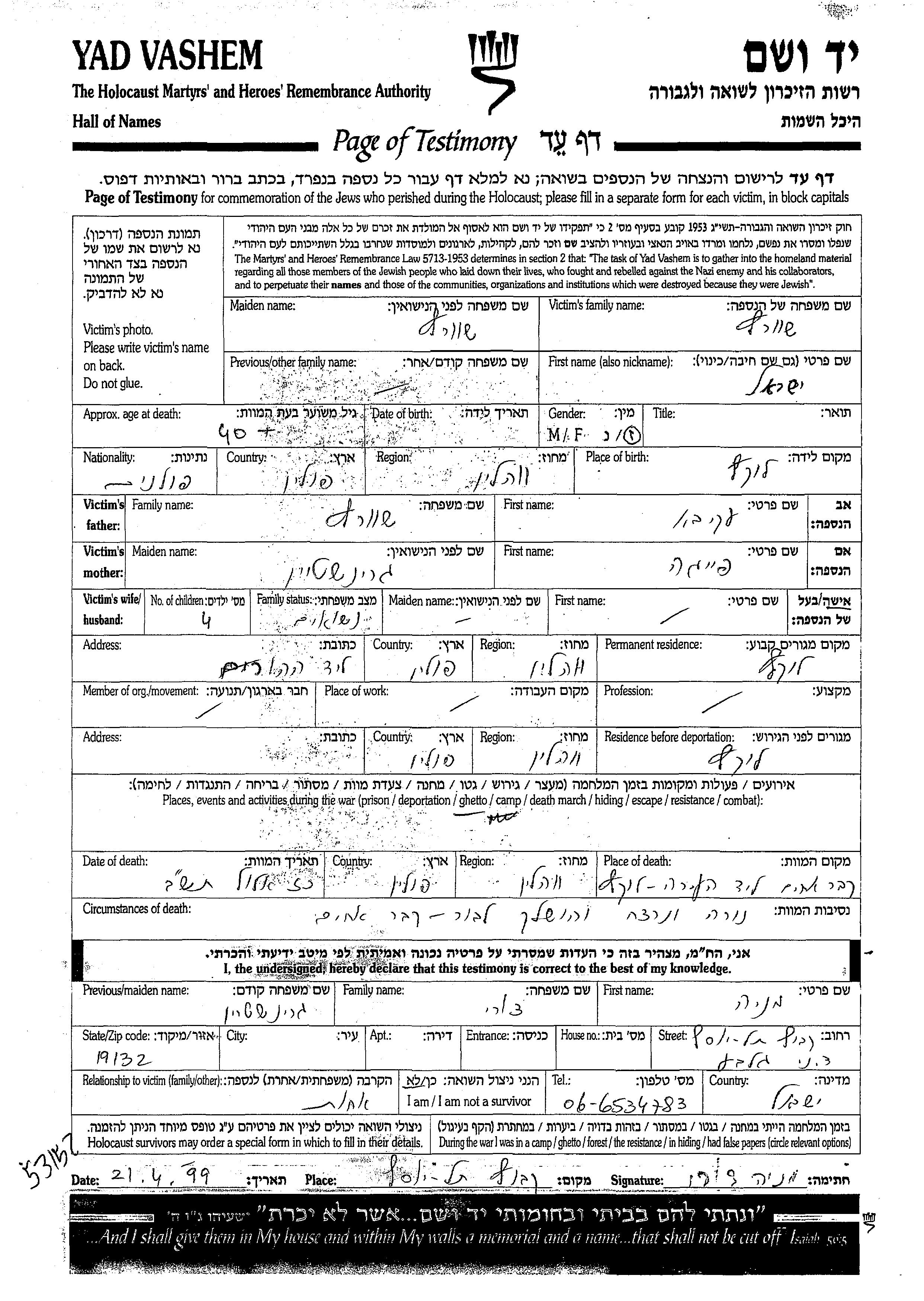 Shvartz Yisrael Luck, Pologne Feuille de témoignage