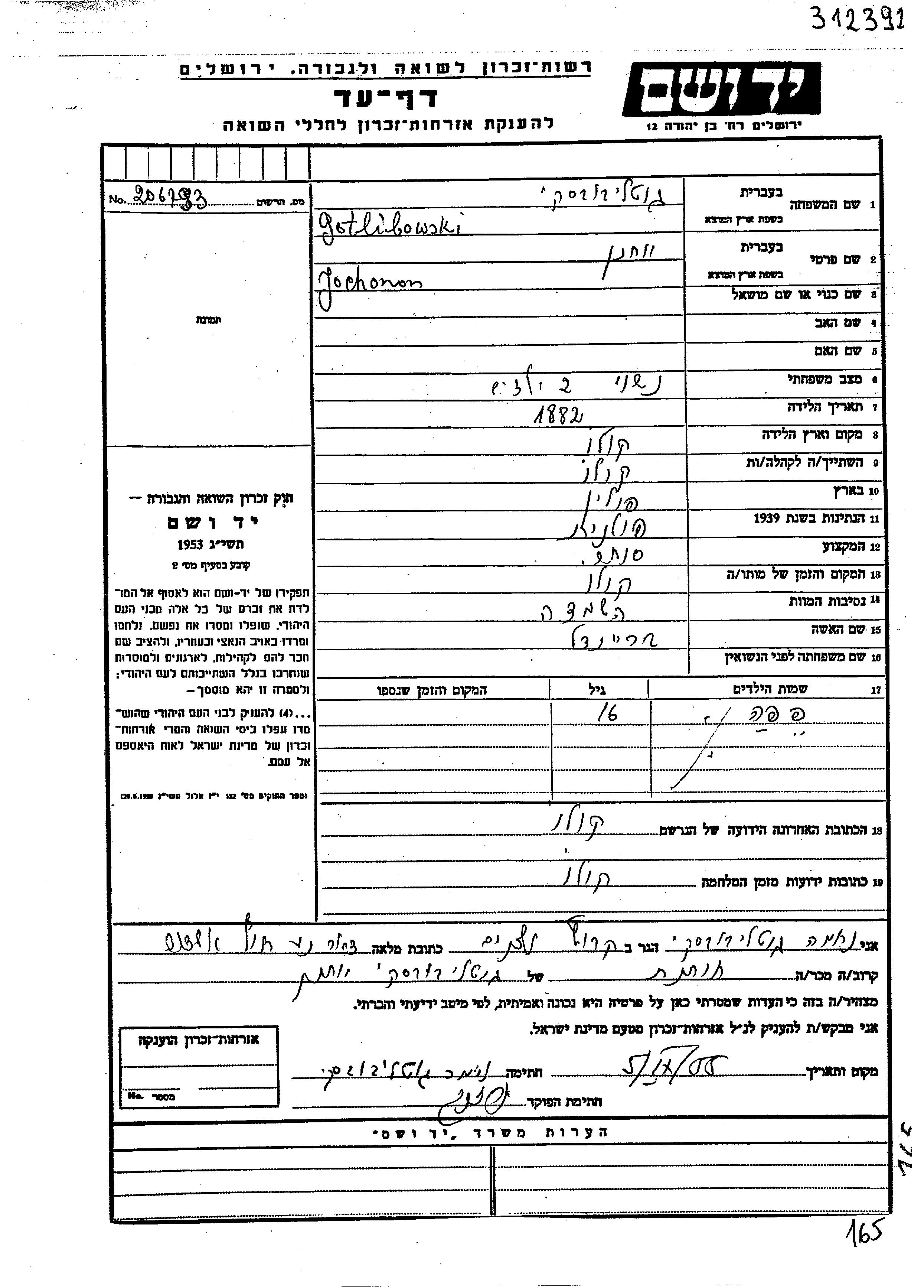 Gotlibovski Yokhanan 1882 Kolo, Pologne Feuille de témoignage