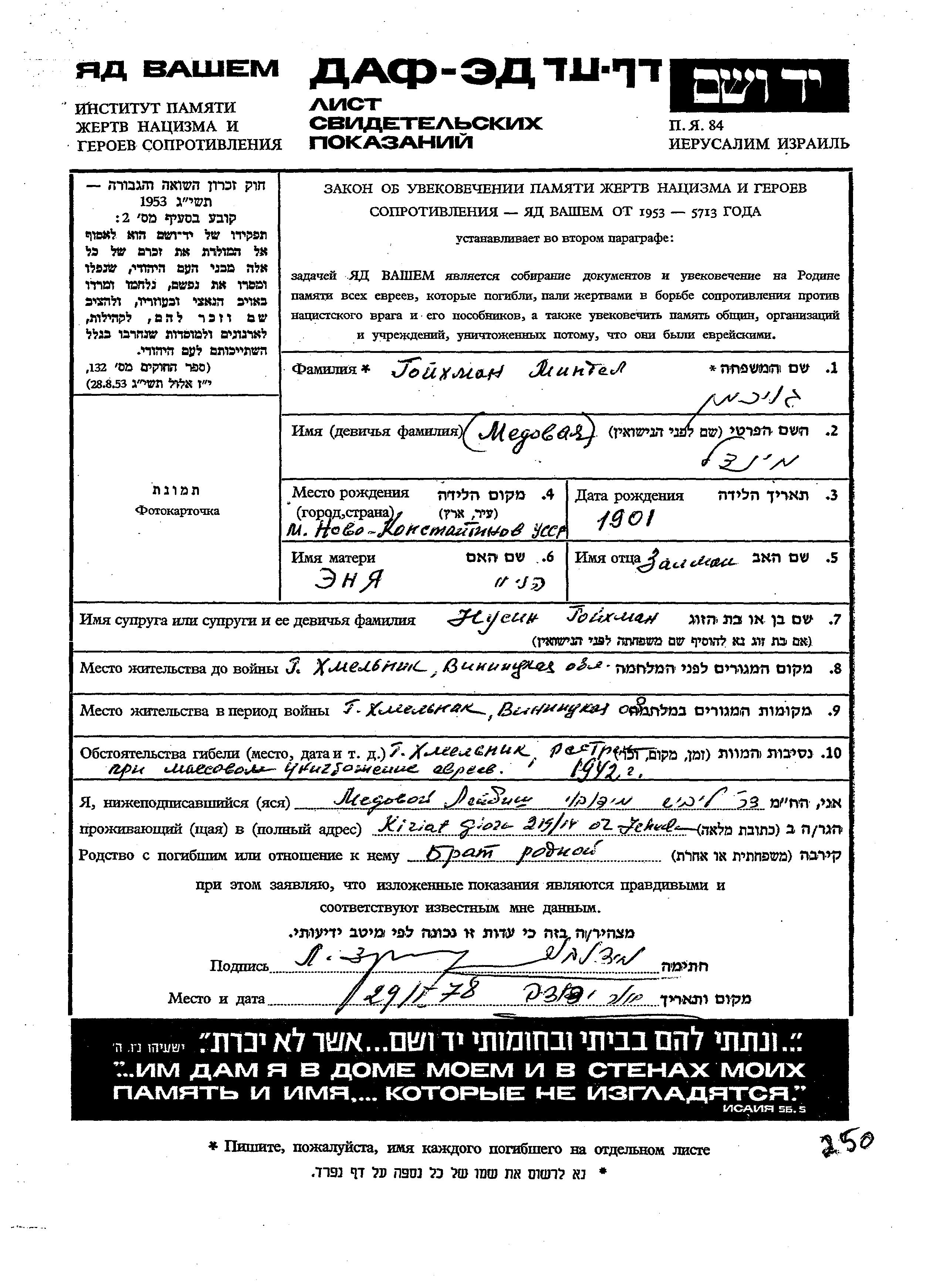 Goikhman Mindl 1901 Khmelnik, Ukraine (URSS) Feuille de témoignage