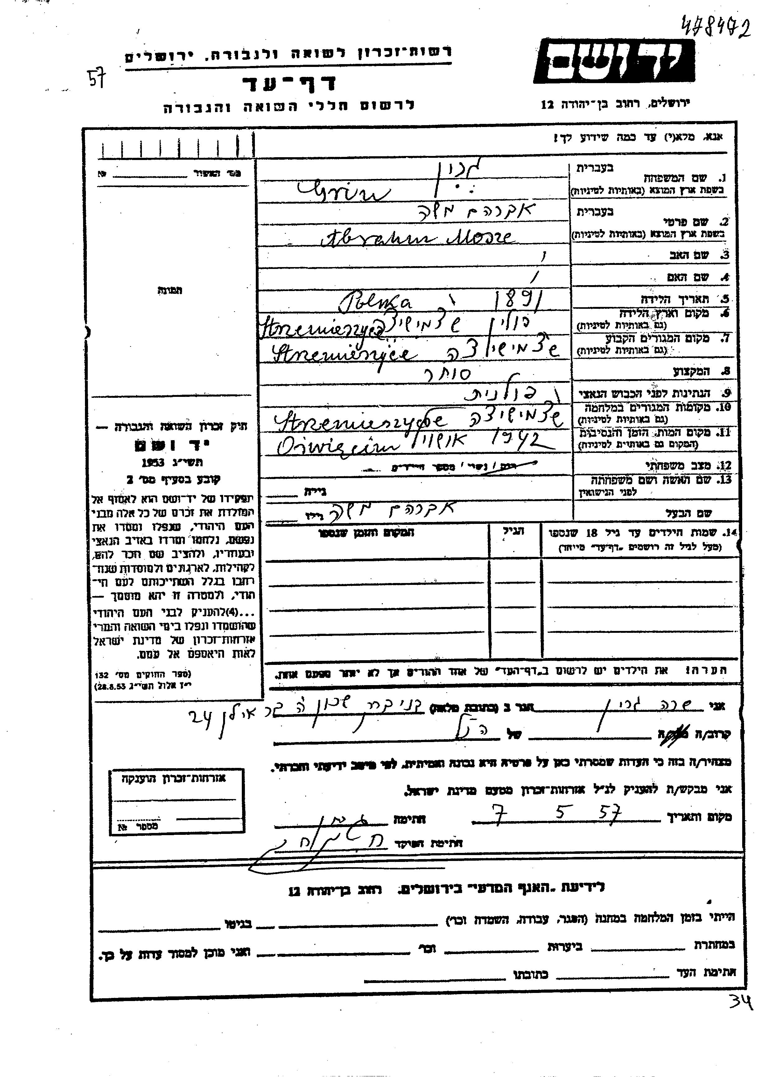 Grin Avraham Moshe 1891 Strzemieszyce, Pologne Feuille de témoignage