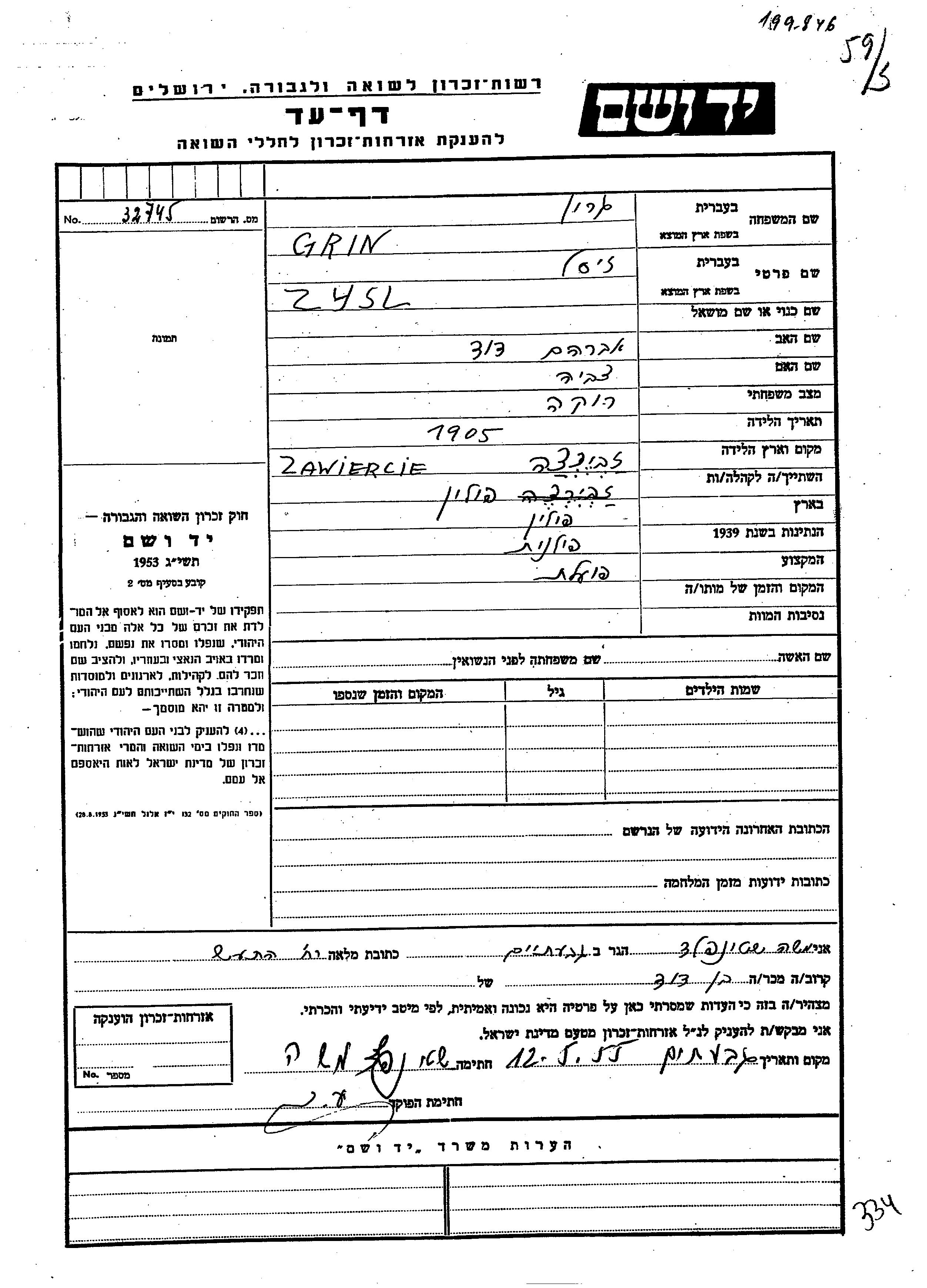 Zysl Grin est née à Zawiercie, Pologne en 1905, fille de David Avraham et de Tzvia. Elle était Ouvrier/e et Célibataire. Avant la seconde guerre mondiale elle vivait à Zawiercie, Pologne.