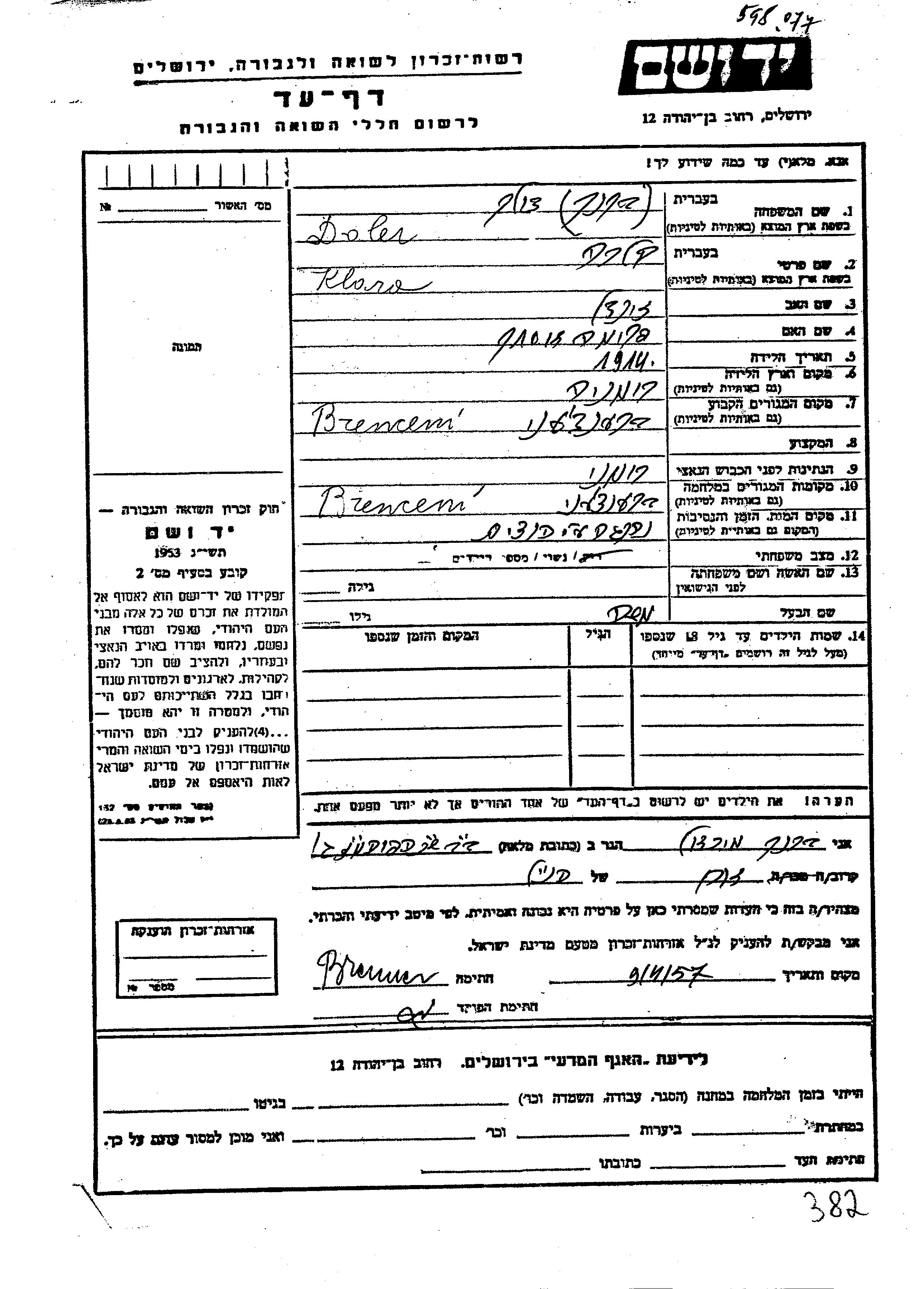 Doler Klara 1914 Briceni, Roumanie Feuille de témoignage