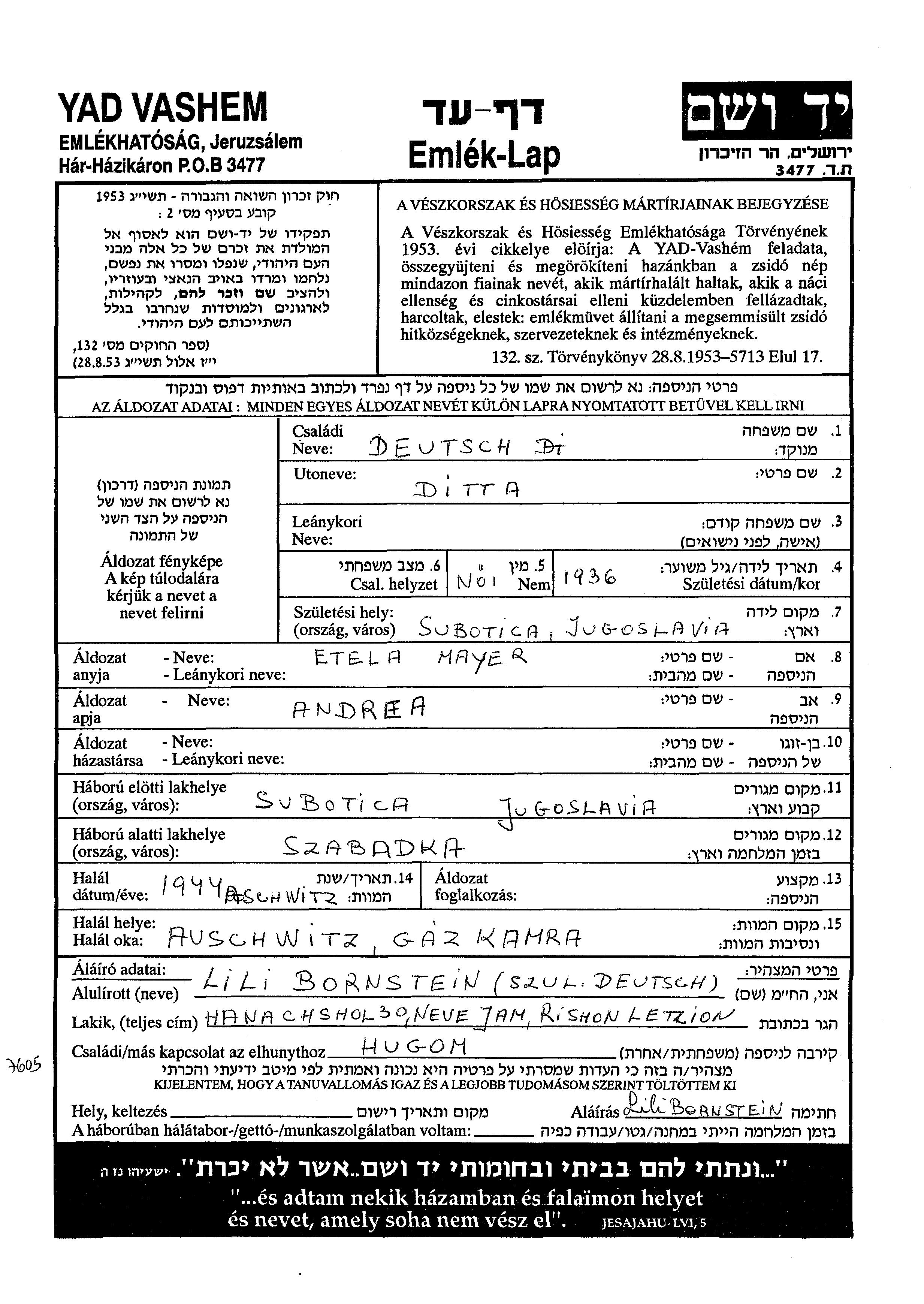 Ditta Deutsch est née à Subotica, Yugoslavie en 1936, fille de Andrea et de Etelae née Mayer. Elle était Enfant. Avant la seconde guerre mondiale elle vivait à Subotica, Yugoslavie. Pendant la guerre, elle était à Szabadka, Yugoslavie.