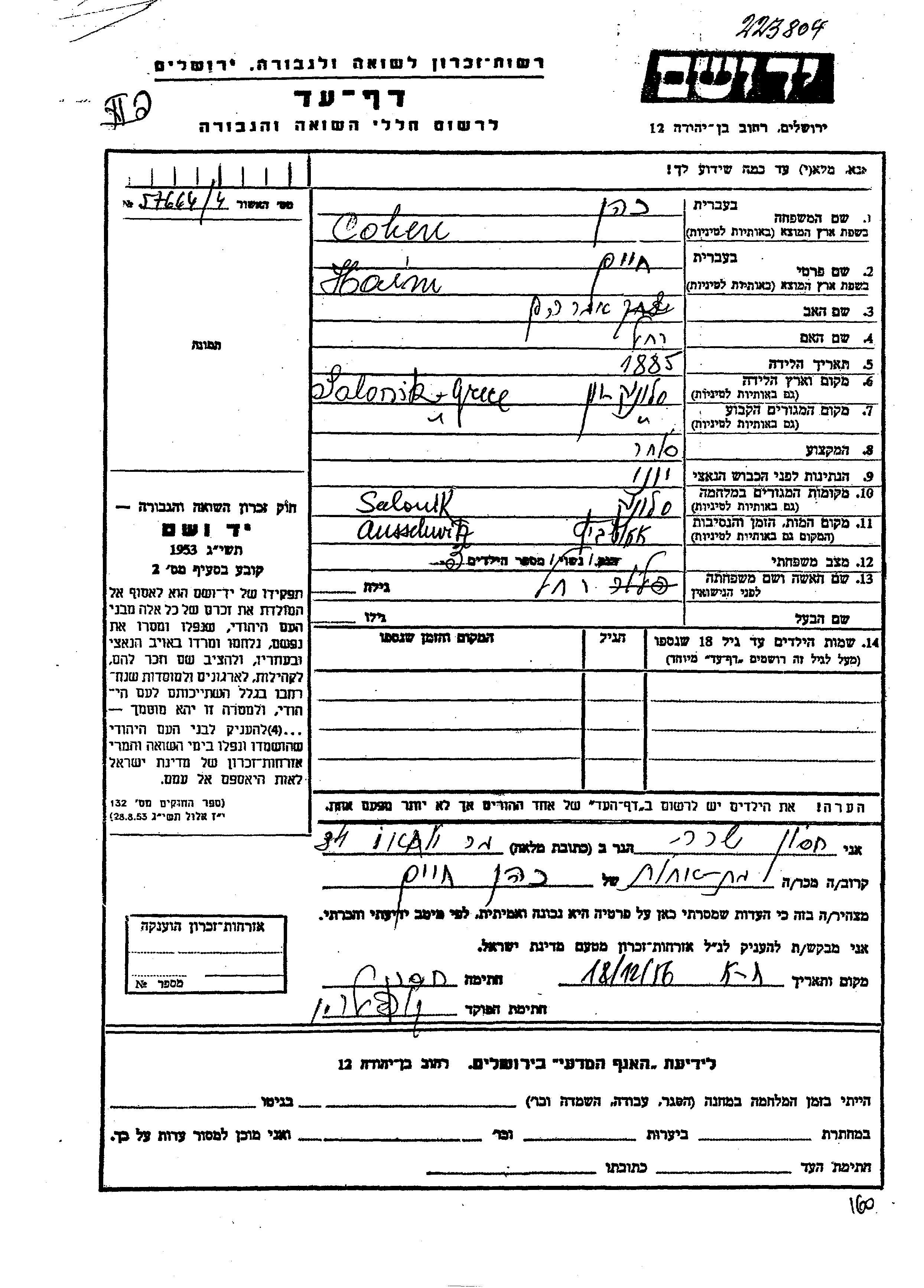 Haim a été assassiné pendant la Shoah. Lieu de la mort: Auschwitz, Pologne.