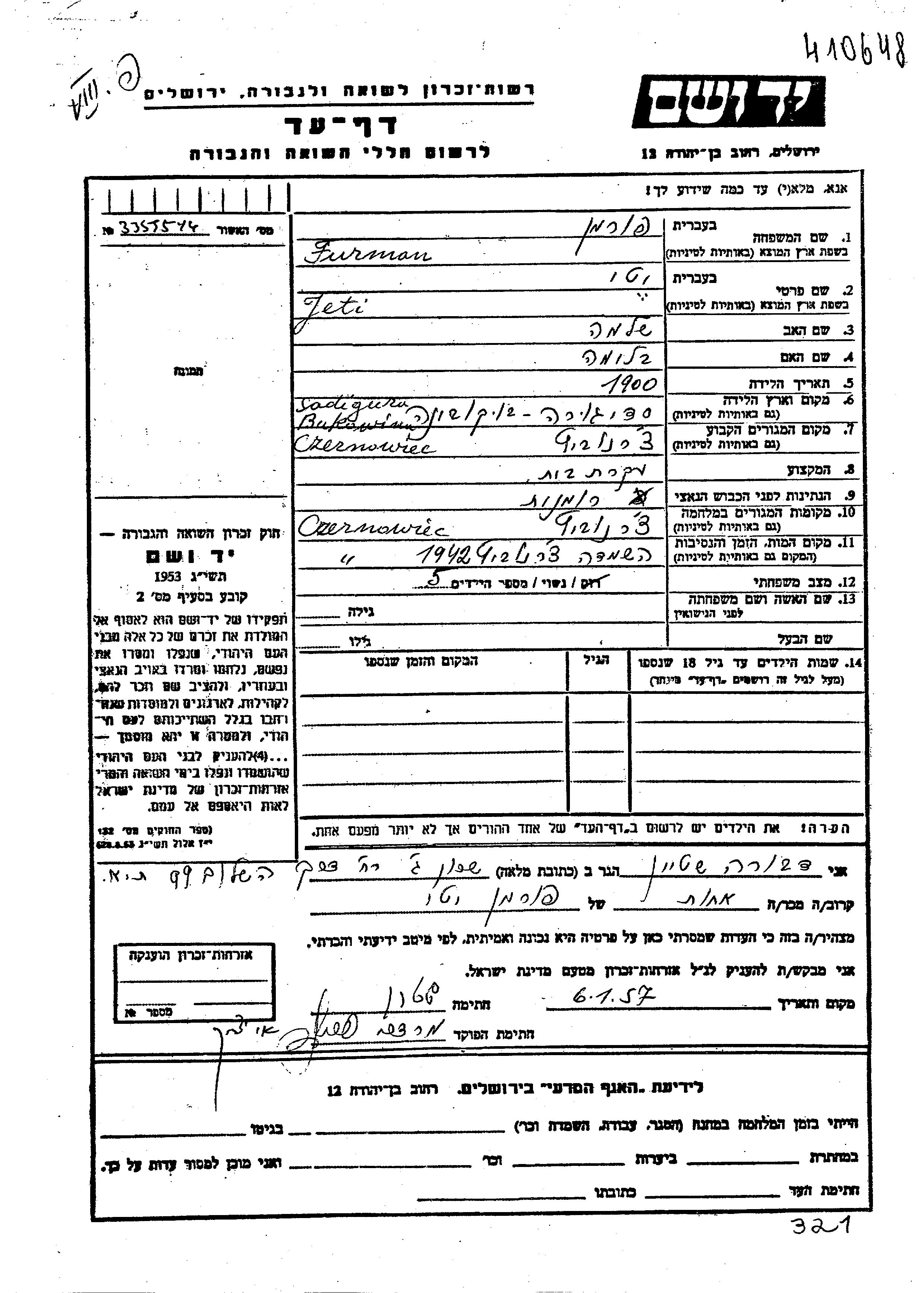 Yehudit Furman est née à Sadigura, Roumanie en 1900, fille de Shlomo et de Bluma. Elle était Femme au foyer et Mariée. Avant la seconde guerre mondiale elle vivait à Czernowic, Roumanie. Pendant la guerre, elle était à Czernowic, Roumanie.