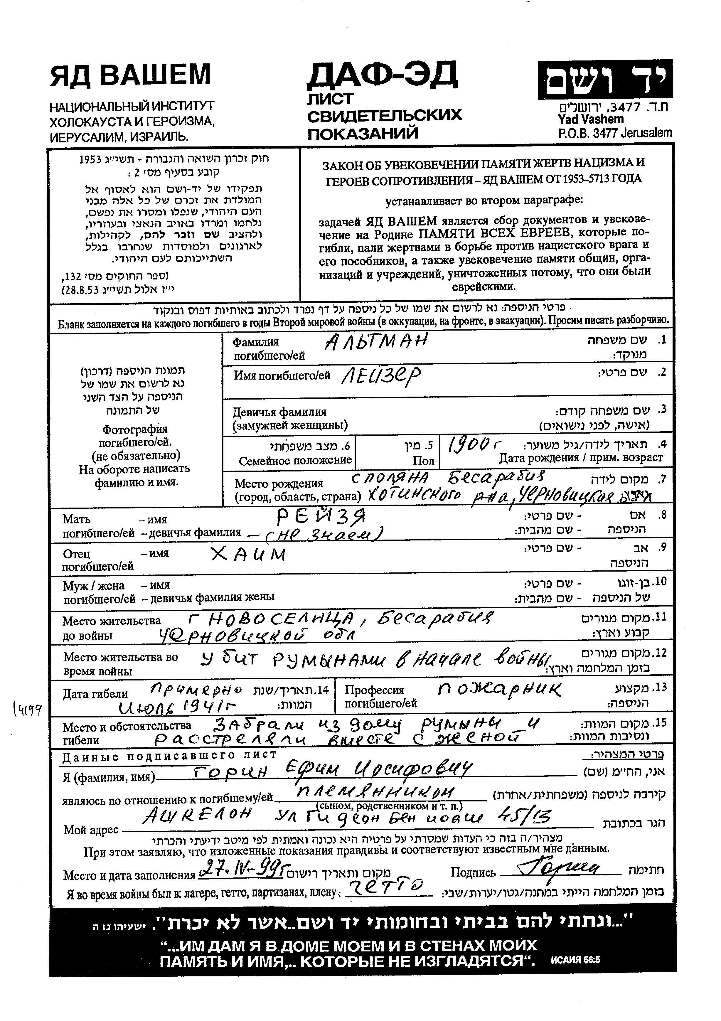 Leizer Altman est né à Polane, Roumanie en 1900, fils de Khaim et de Reizya. Il était Pompier. Avant la seconde guerre mondiale il vivait à Novoselita, Roumanie. Au cours de la guerre, il était à Novoselita, Roumanie.