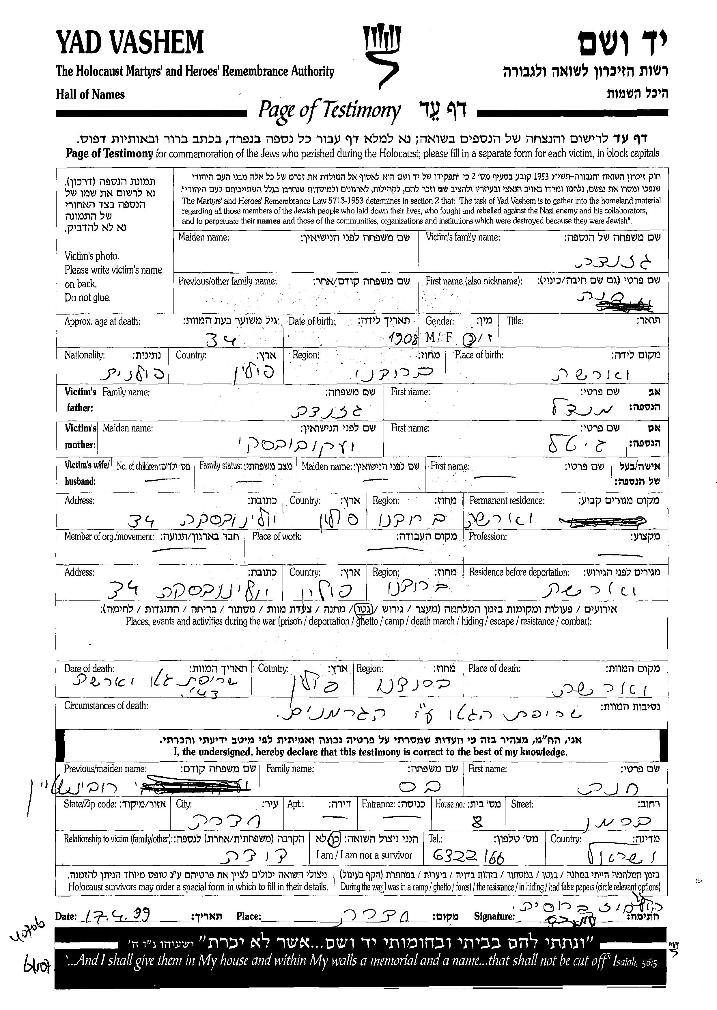 Yad Vashem - Pages of Testimony Names Memorial Collection
