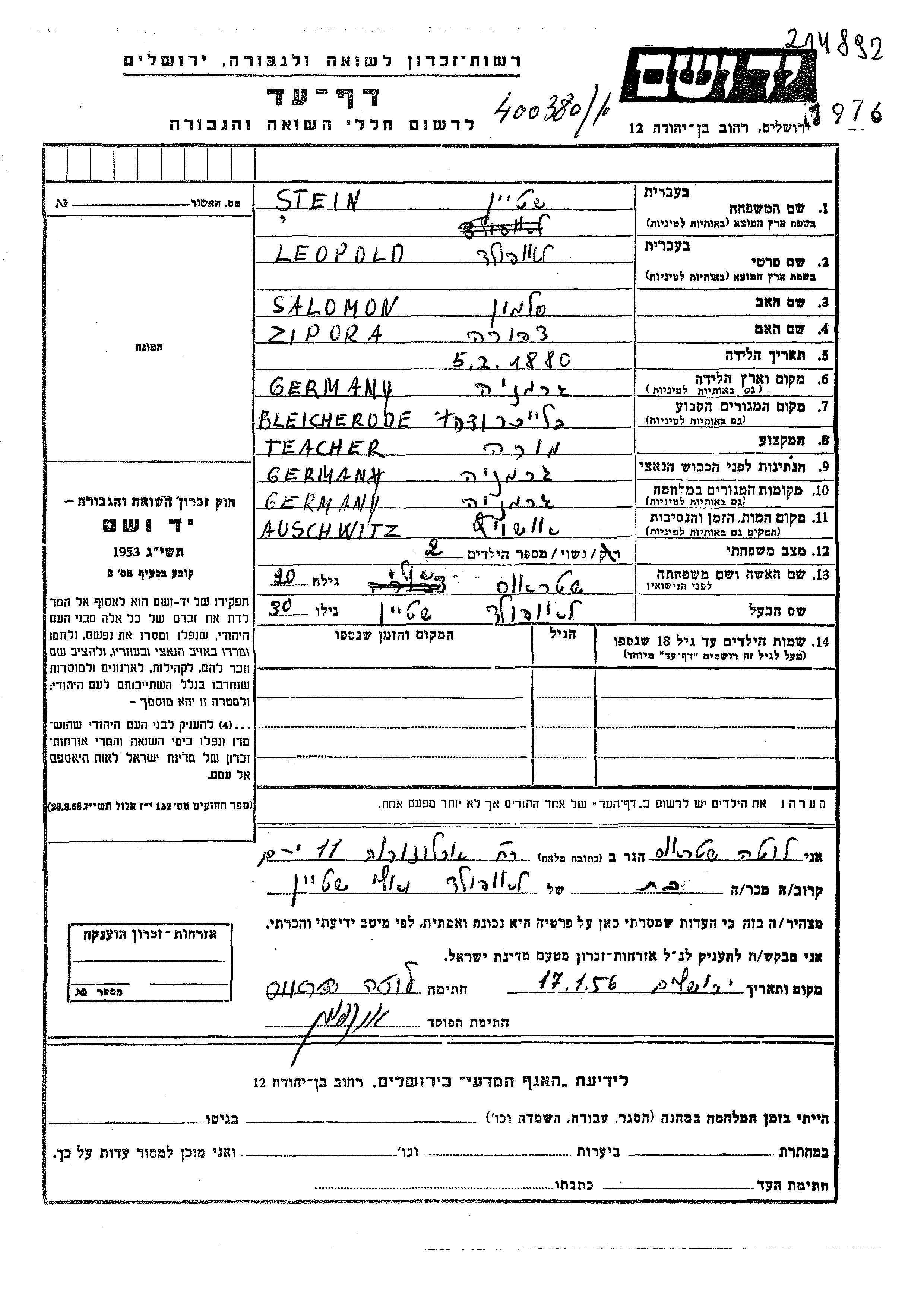 Leopold Stein est né à Allemagne en 1880, fils de Salomon et de Zipora. Il était Enseignant/e et Mariée à Ester née Shtraus. Avant la seconde guerre mondiale il vivait à Bleicherode, Allemagne. Au cours de la guerre, il était à Allemagne.