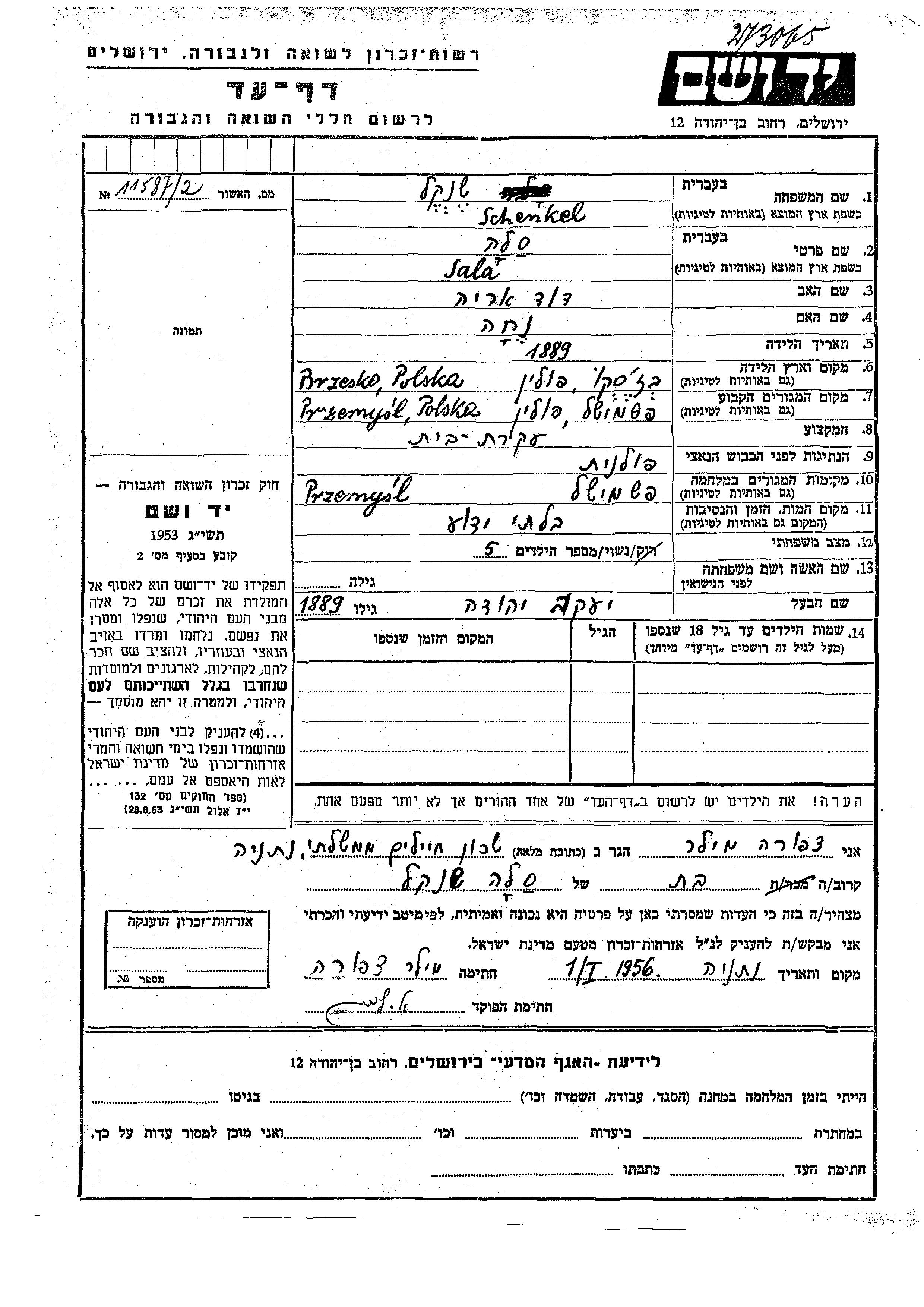 Sala Schenkel est née à Brzesko, Pologne en 1889, fille de David Arie et de Nekha. Elle était Femme au foyer et Mariée à Yaakov Yehuda. Avant la seconde guerre mondiale elle vivait à Przemysl, Pologne. Pendant la guerre, elle était à Przemysl, Pologne.