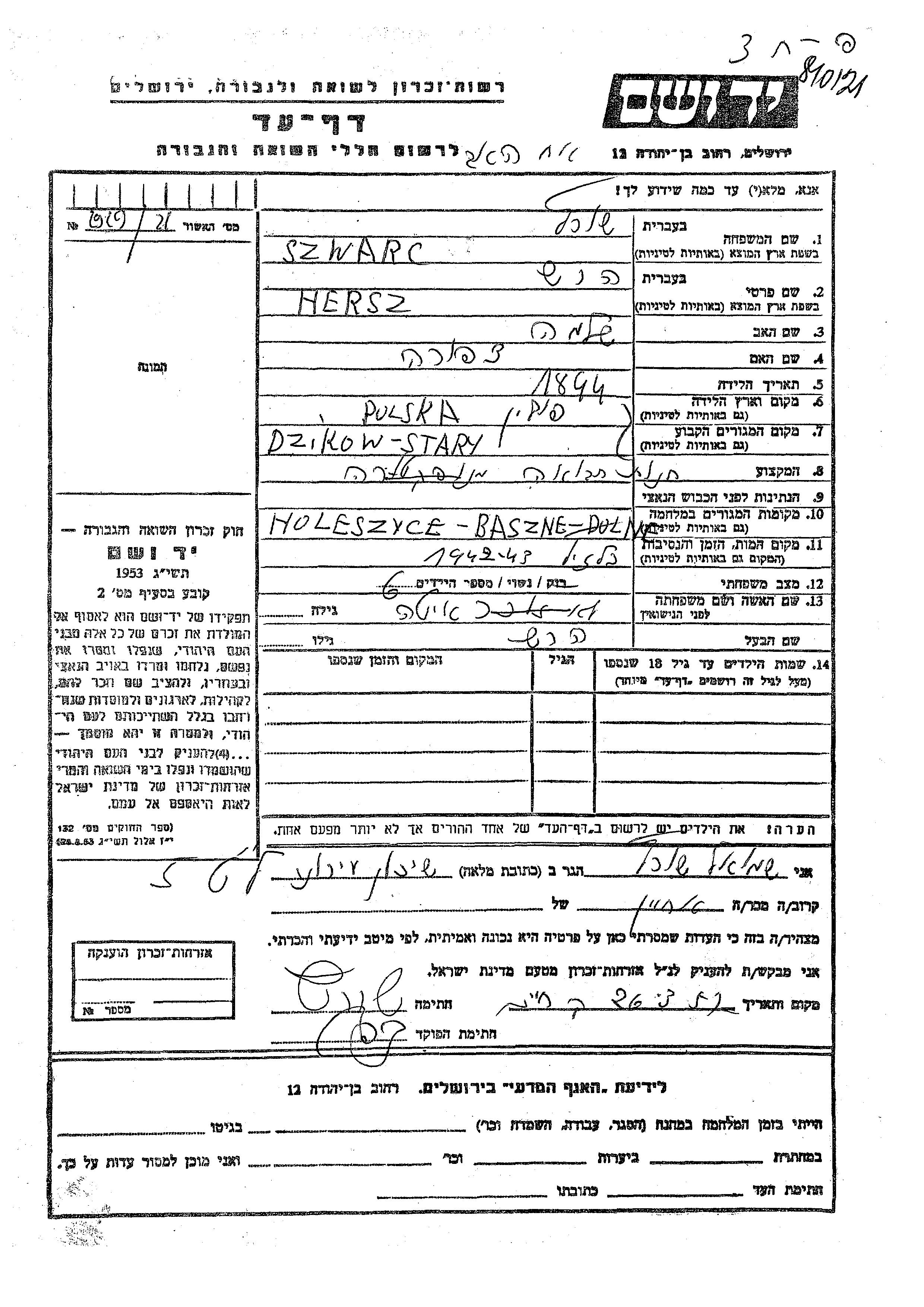 Szwarc Hersz 1894 Dzikow Stary, Pologne Feuille de témoignage