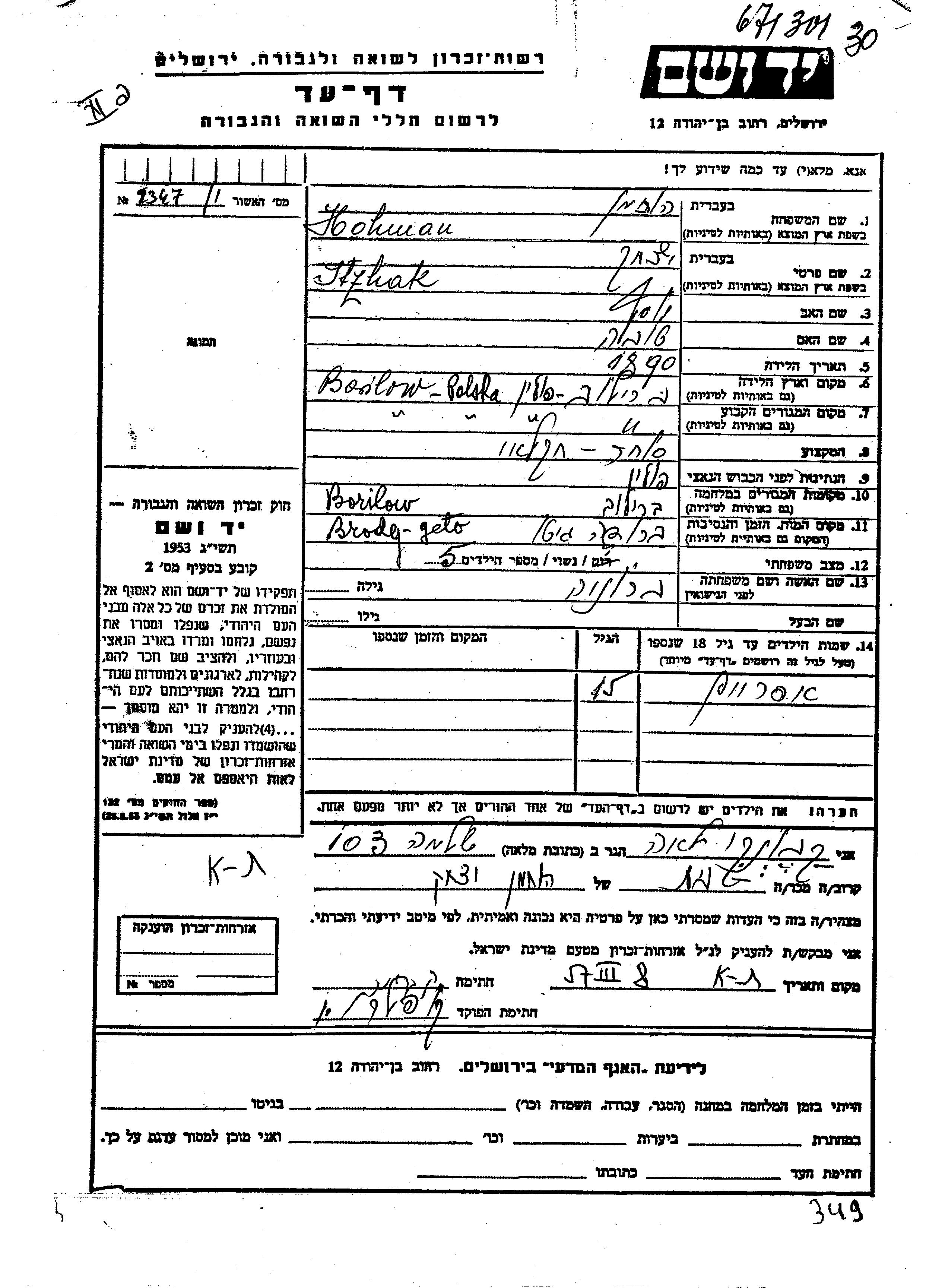 Hohman Yitzkhak 1890 Barilow, Pologne Feuille de témoignage