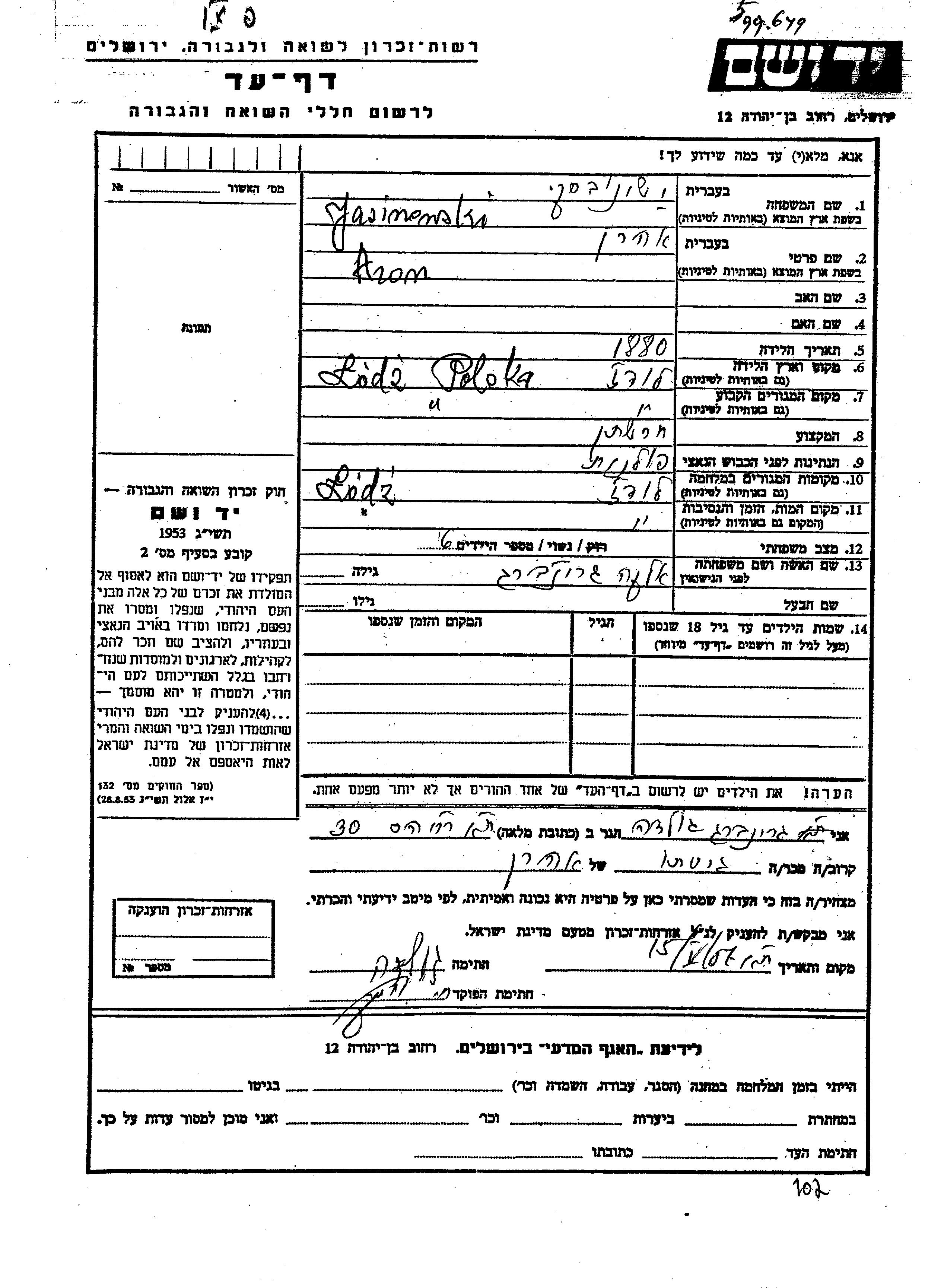 Jasinowski Aharon 1880 Lodz, Pologne Feuille de témoignage