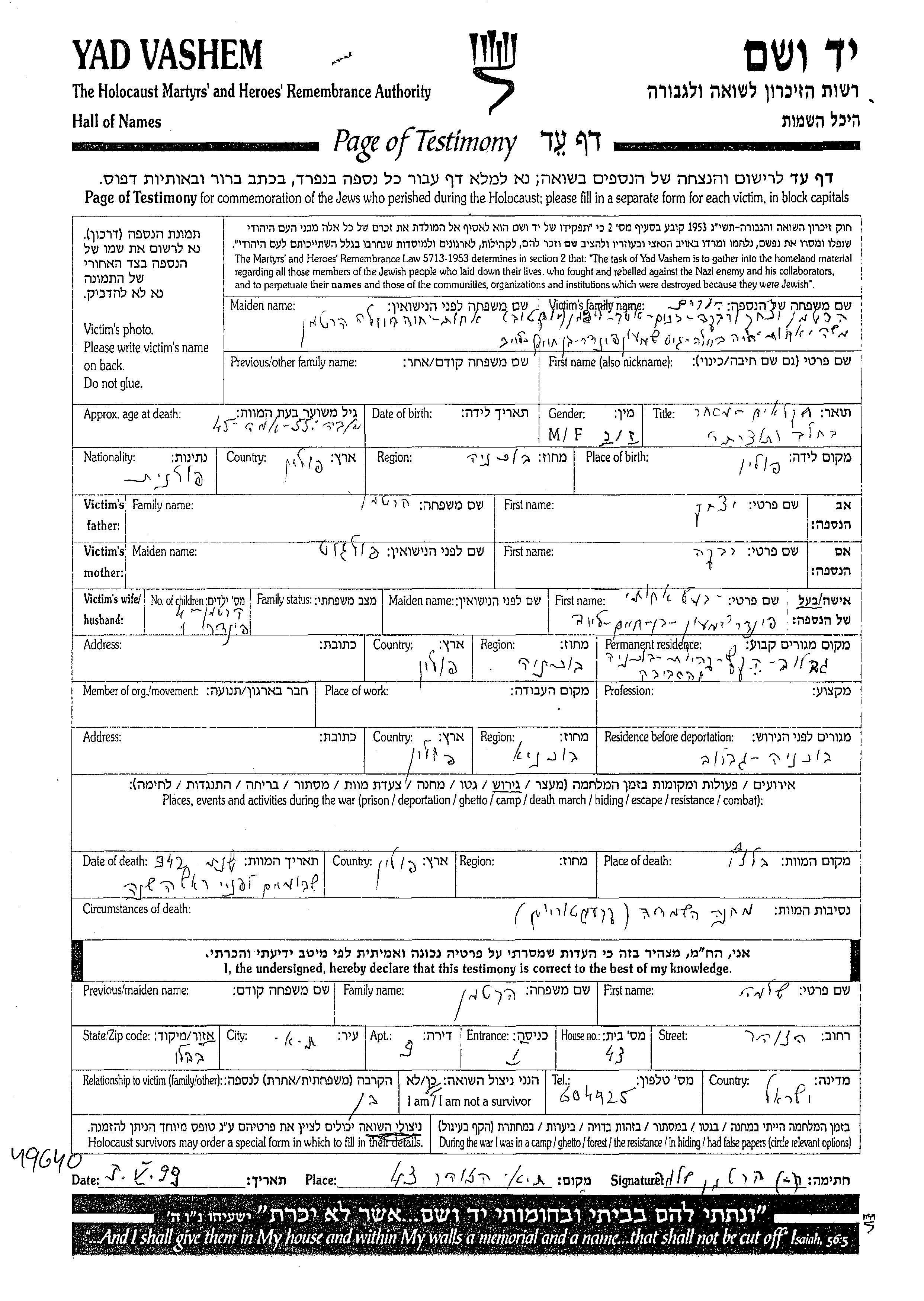Yad Vashem - Pages of Testimony Names Memorial Collection