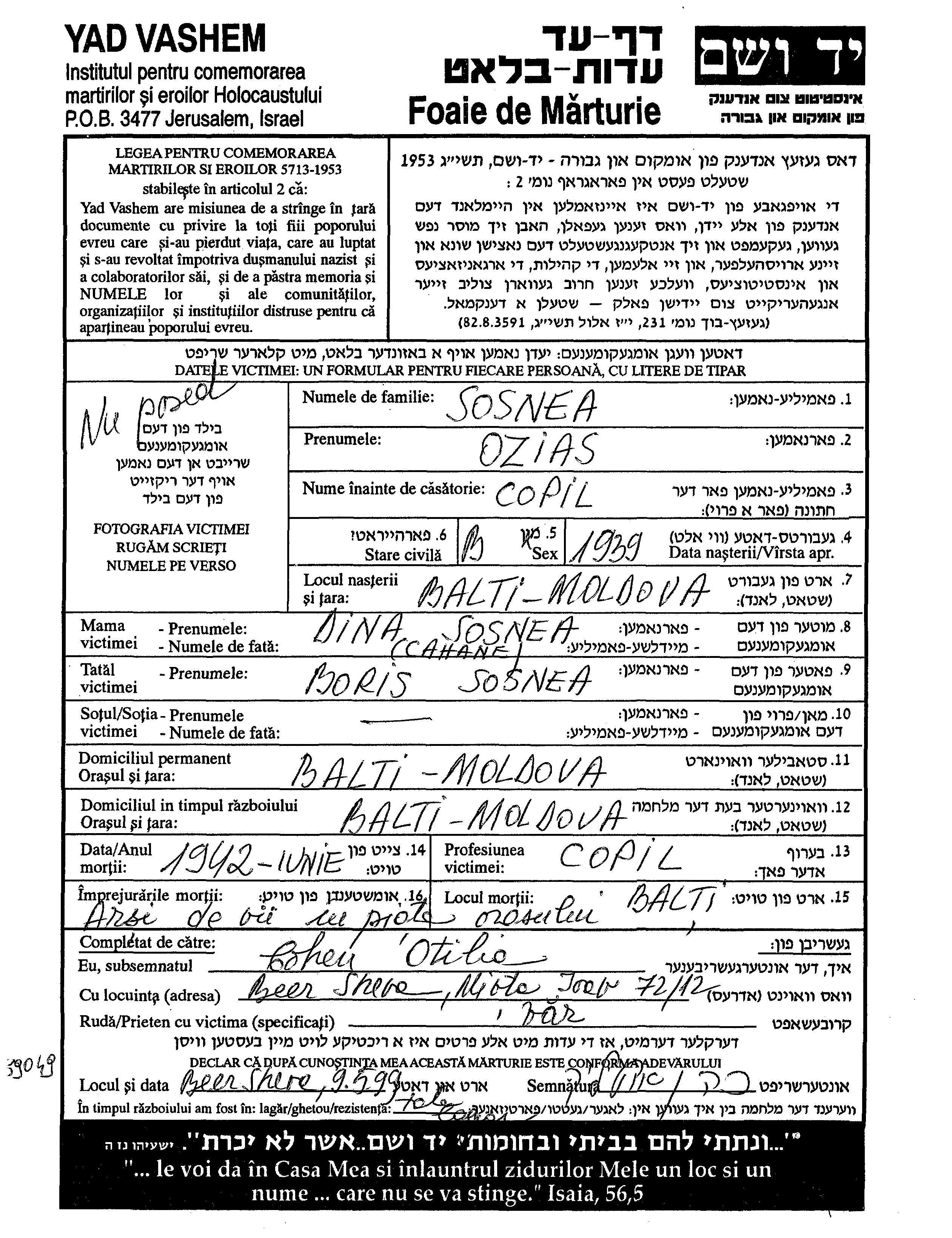 Sosnea Ozias 1939 Bălți, Roumanie Feuille de témoignage