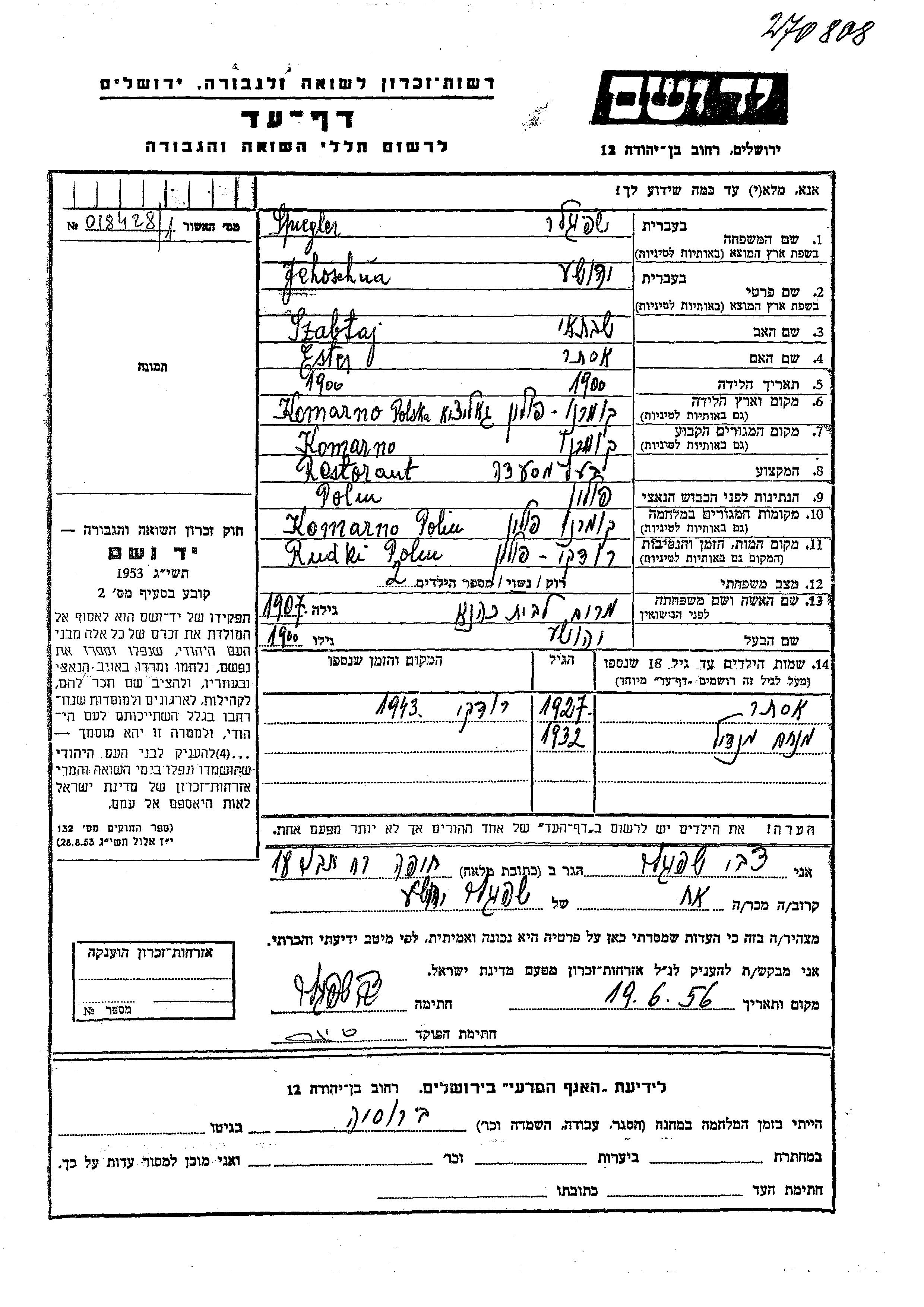 Spiegler Jehoschua 1900 Komarno, Pologne Feuille de témoignage