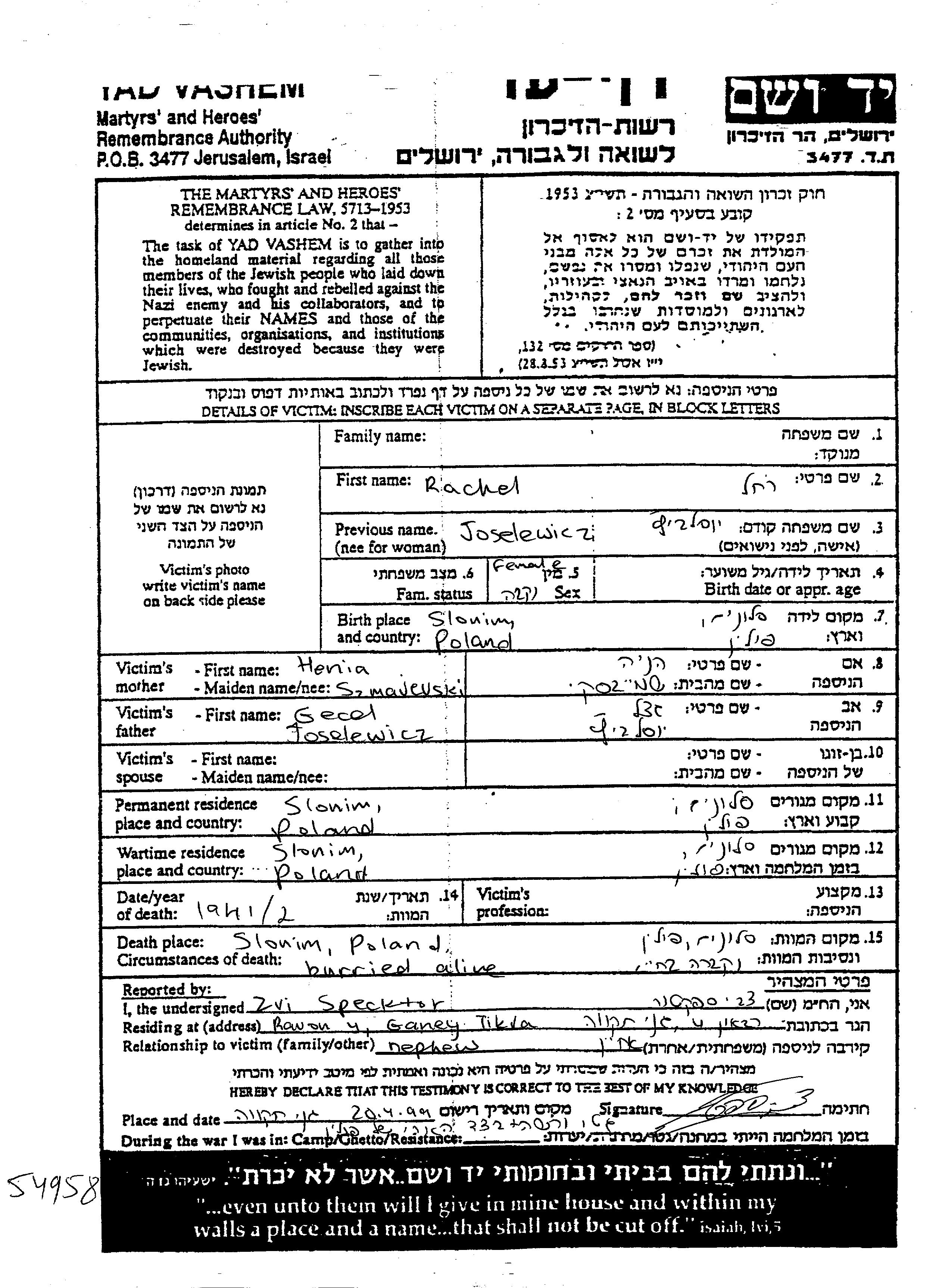 nom inconnu Rakhel Slonim, Pologne Feuille de témoignage