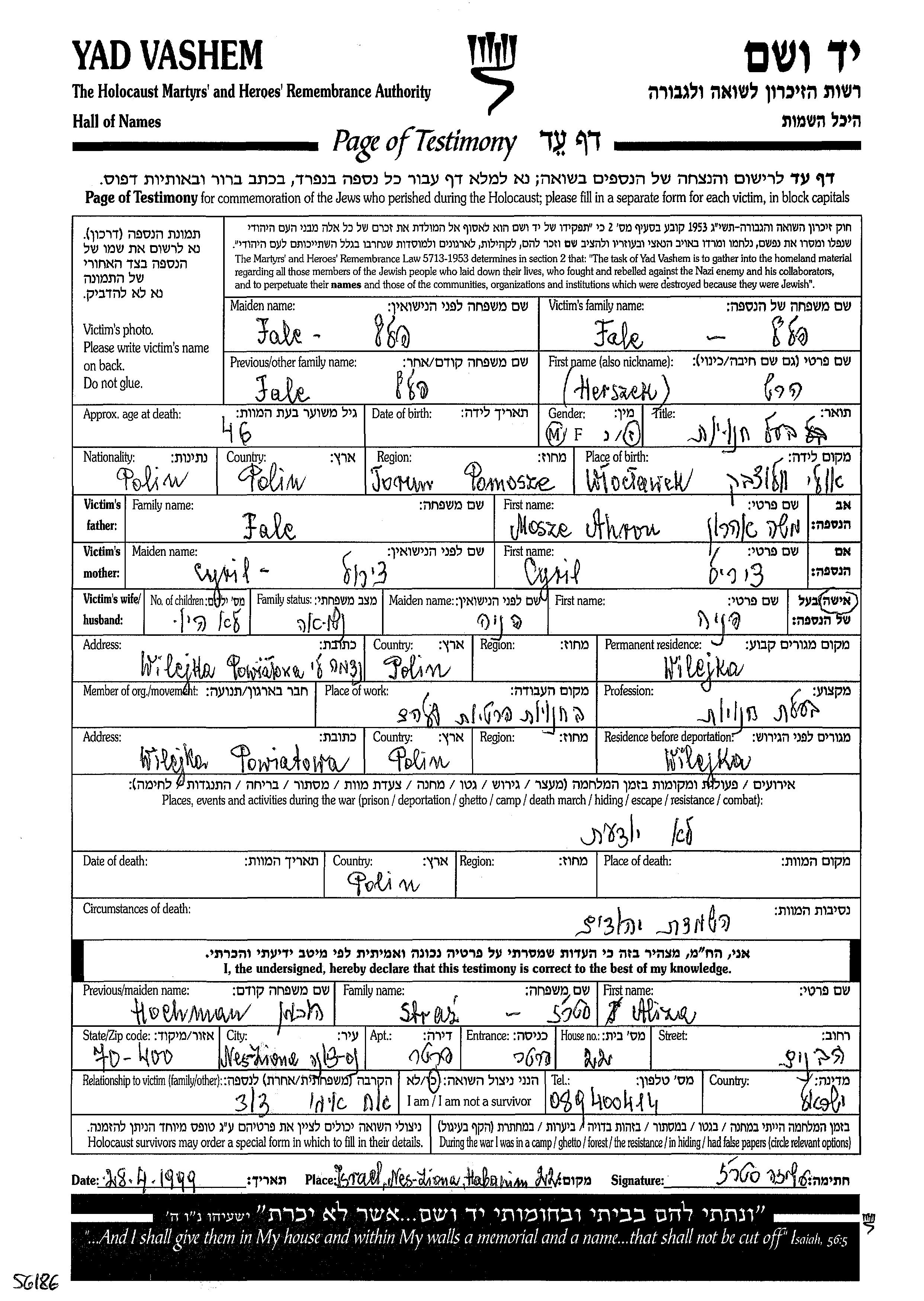 Faltz Herszek Wilejka, Pologne Feuille de témoignage