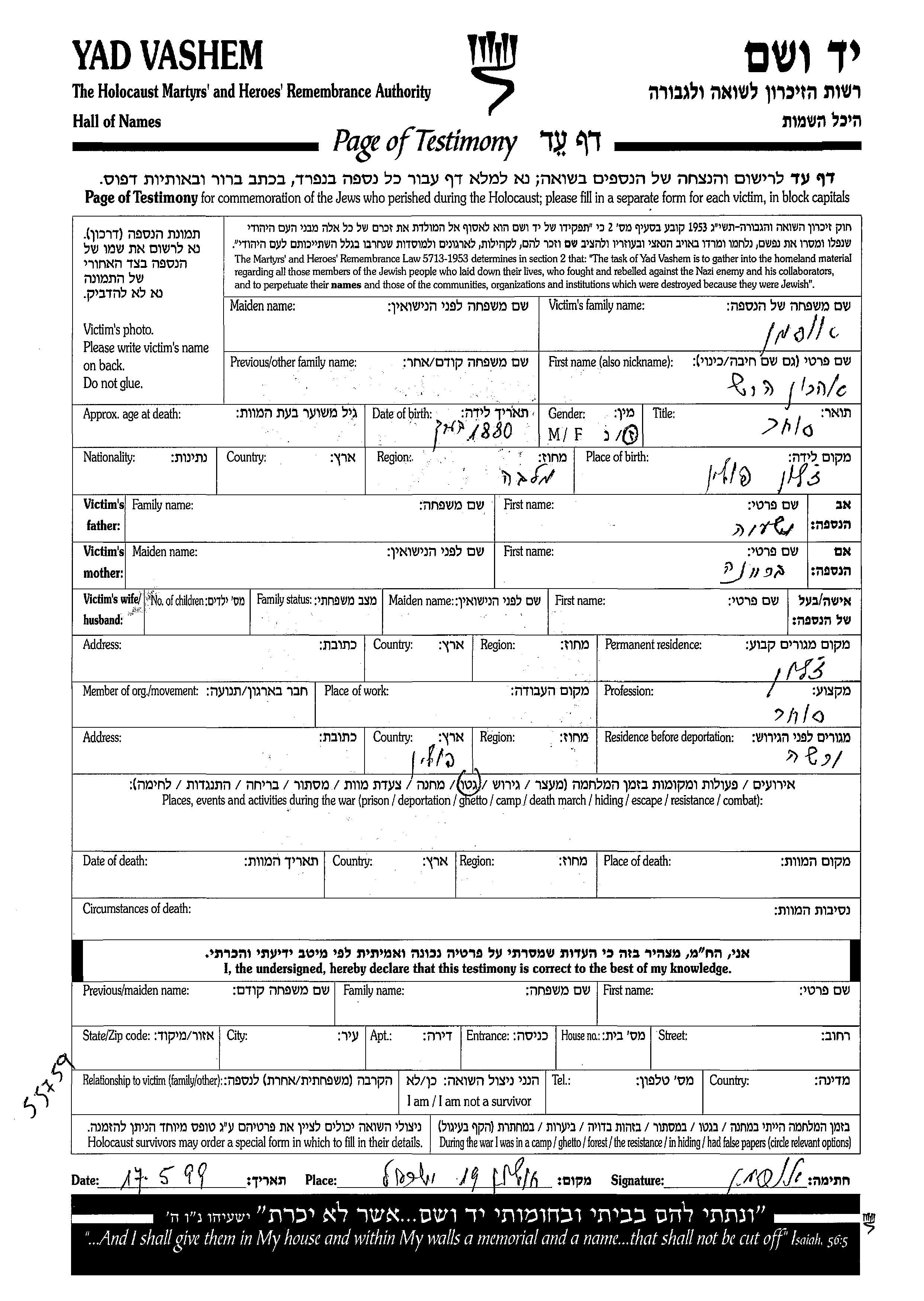 Yad Vashem - Pages of Testimony Names Memorial Collection
