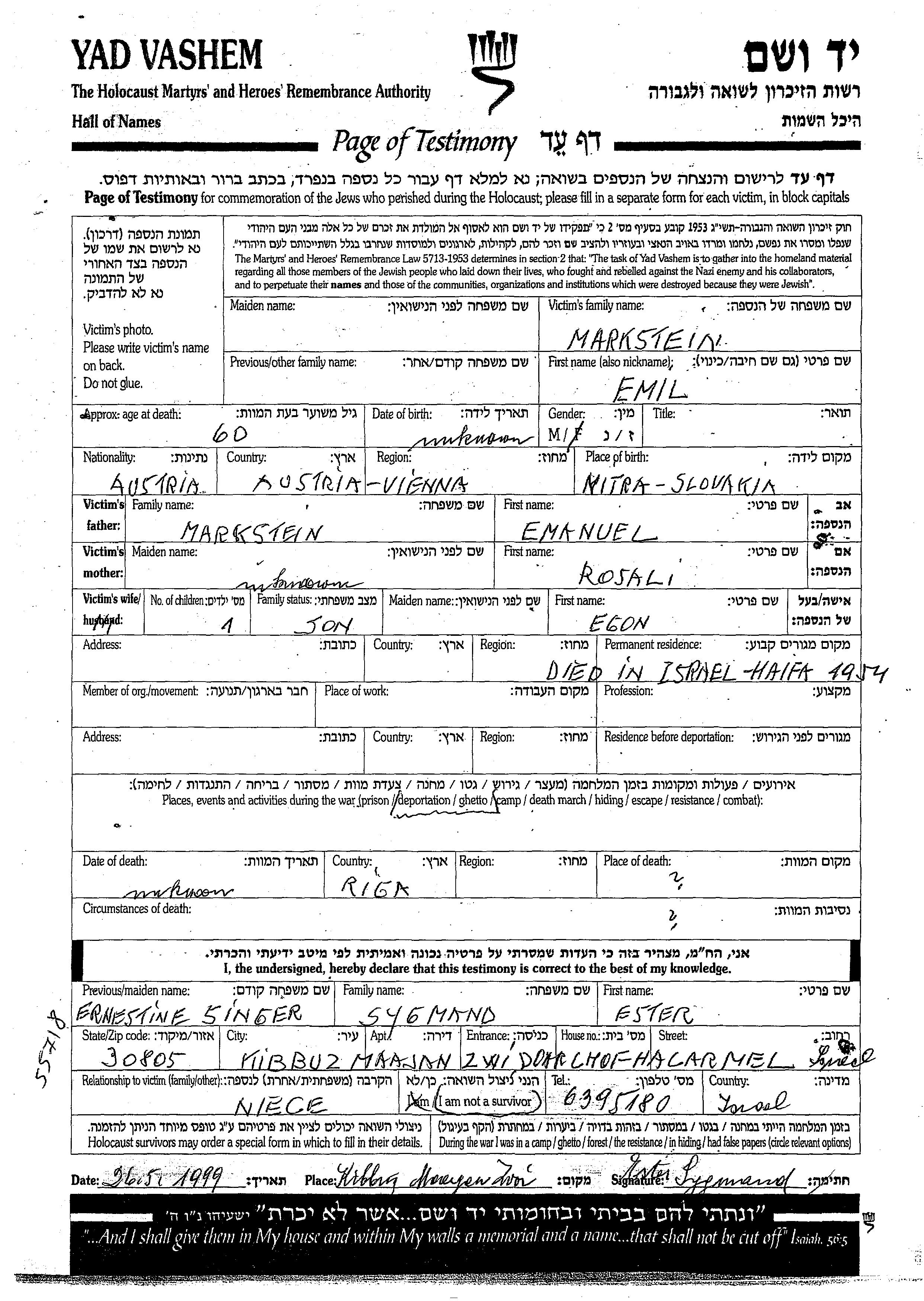 Markstein Emil endroit inconnu, Feuille de témoignage