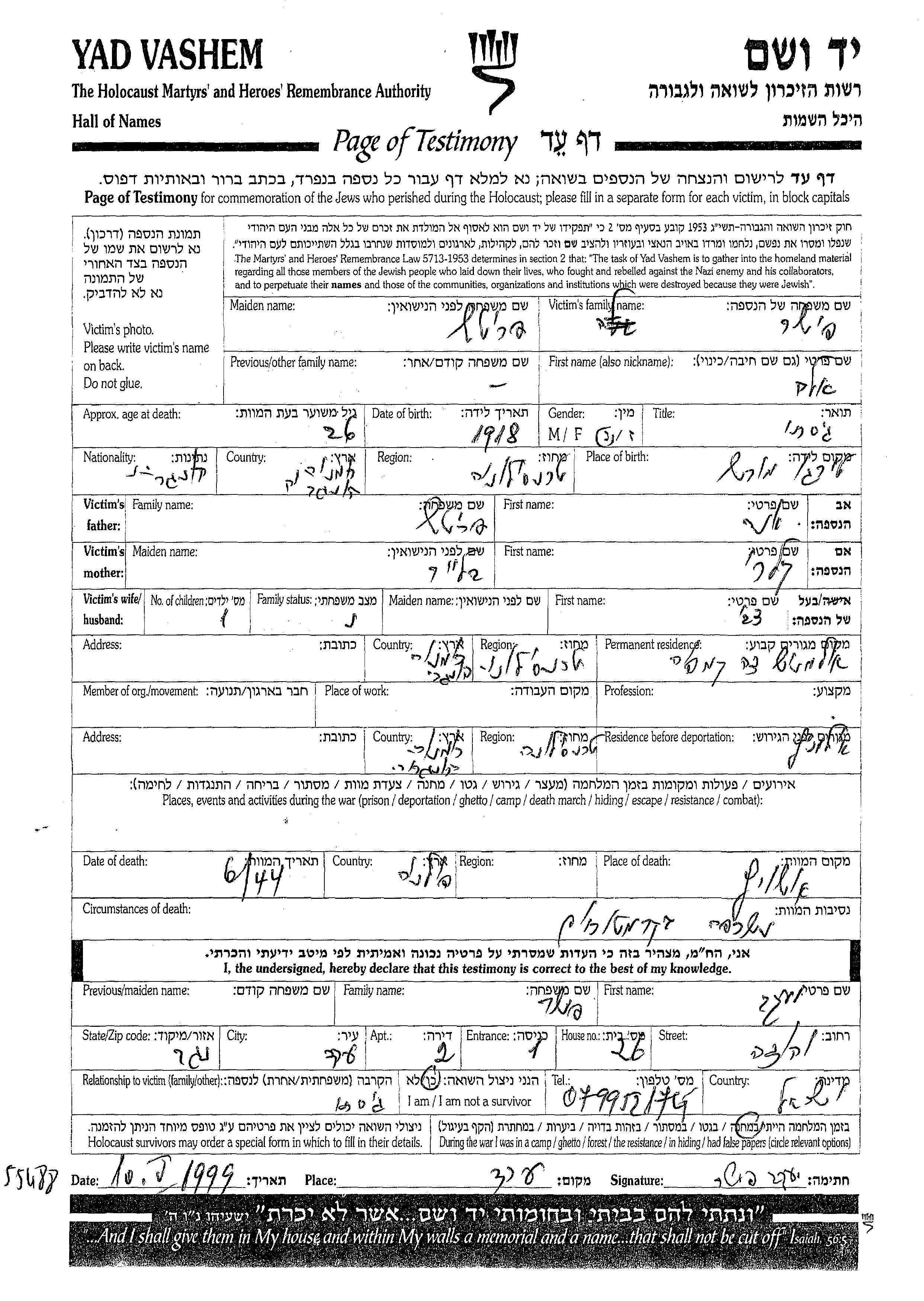 Yad Vashem - Pages of Testimony Names Memorial Collection