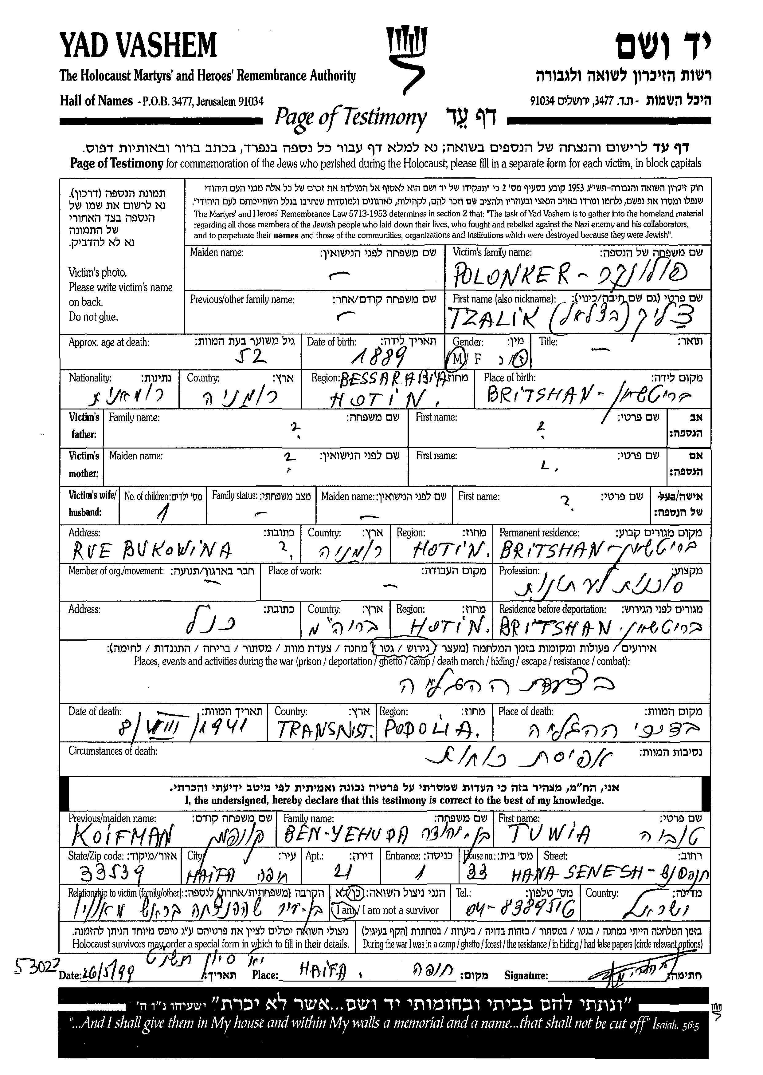 Betzalel Polonker est né à Britshan, Roumanie en 1889. Il était סוכנות לעתונים. Avant la seconde guerre mondiale il vivait à Britshan, Roumanie. Au cours de la guerre, il était à Britshan, Roumanie.
