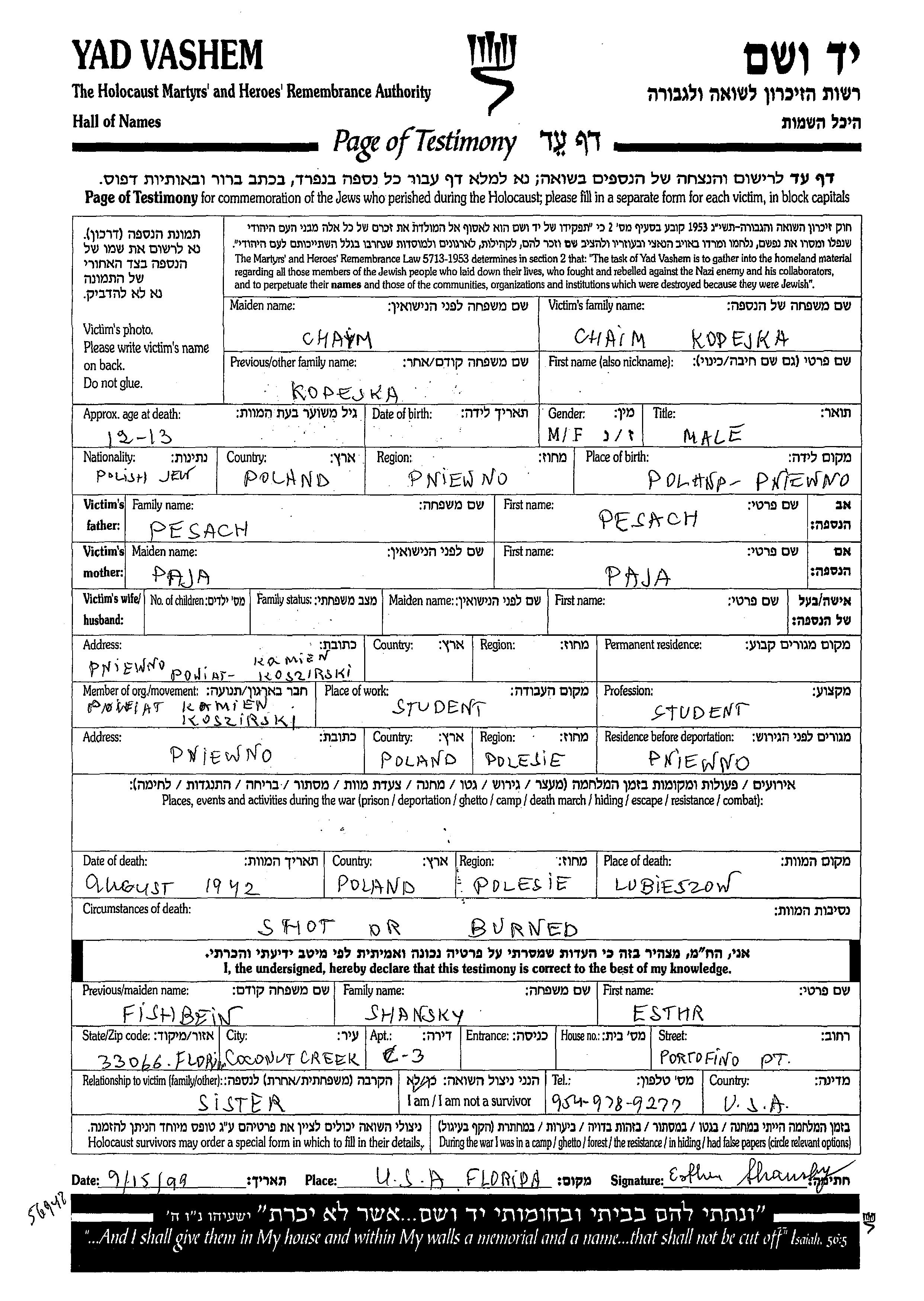 Kopejka Chaim Pniewno, Pologne Feuille de témoignage