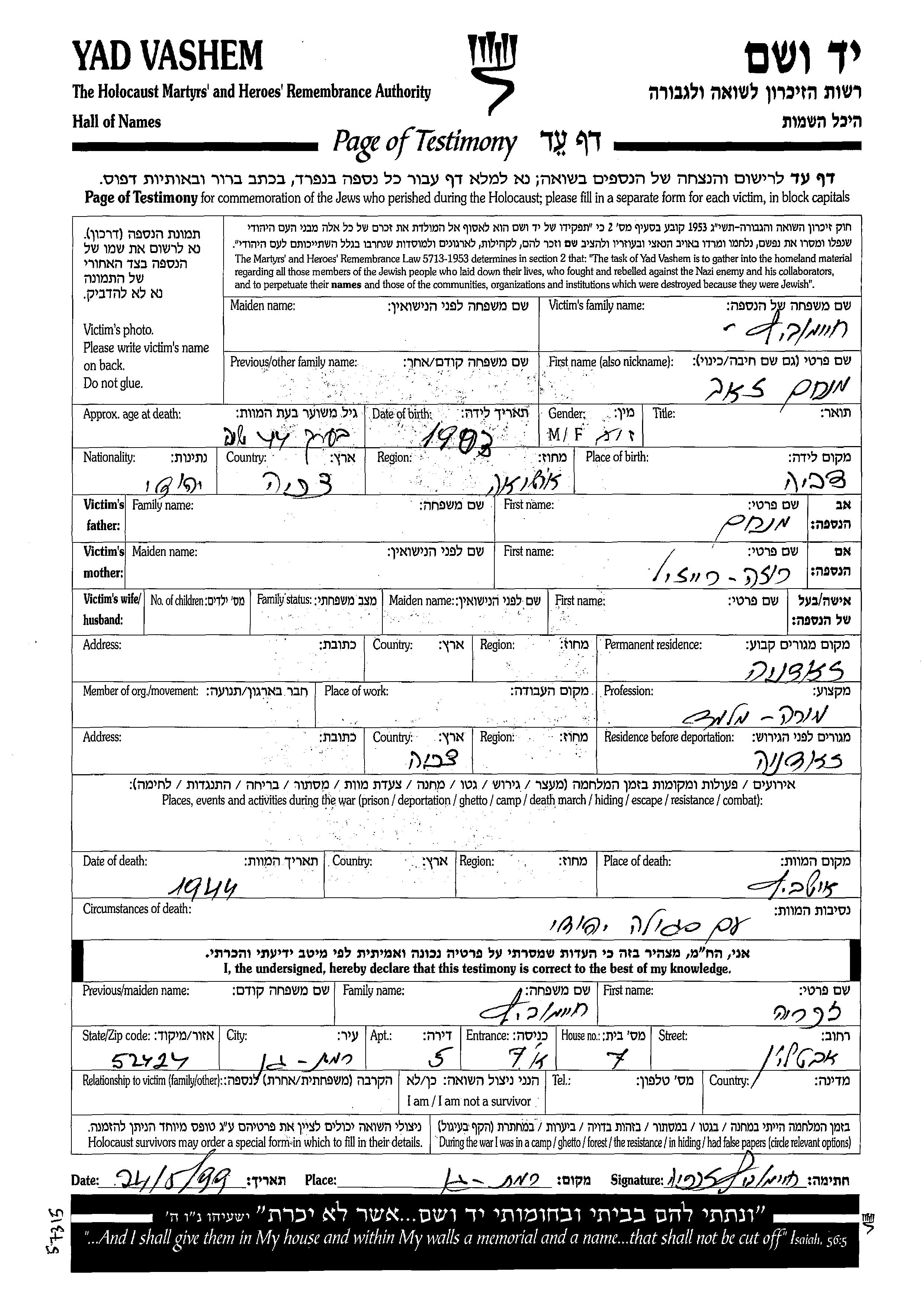 Yad Vashem - Pages of Testimony Names Memorial Collection