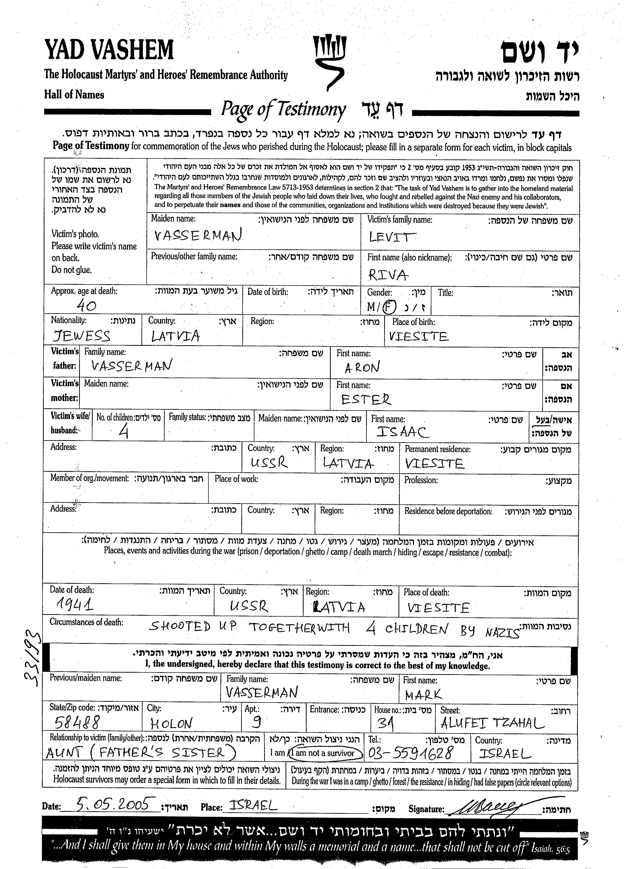 Riva Levit née Vasserman est née à Viesite, Lettonie, fille de Aron et de Ester. Elle était Mariée à Isaac. Avant la seconde guerre mondiale elle vivait à Viesite, Lettonie.