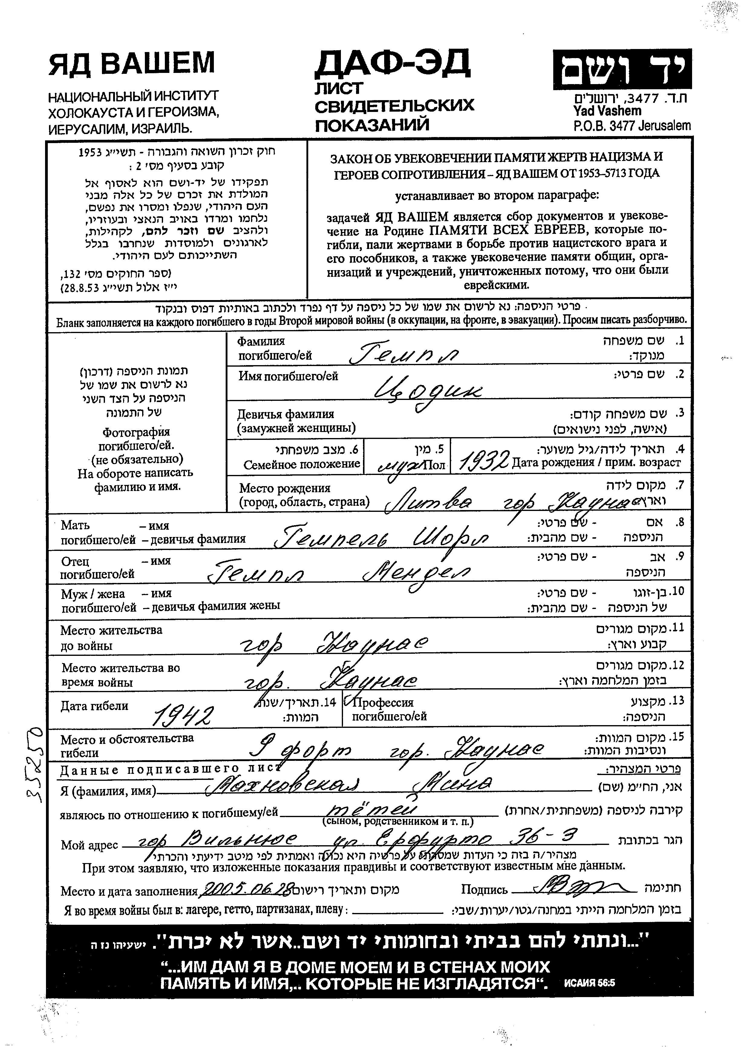 Yad Vashem - Pages of Testimony Names Memorial Collection