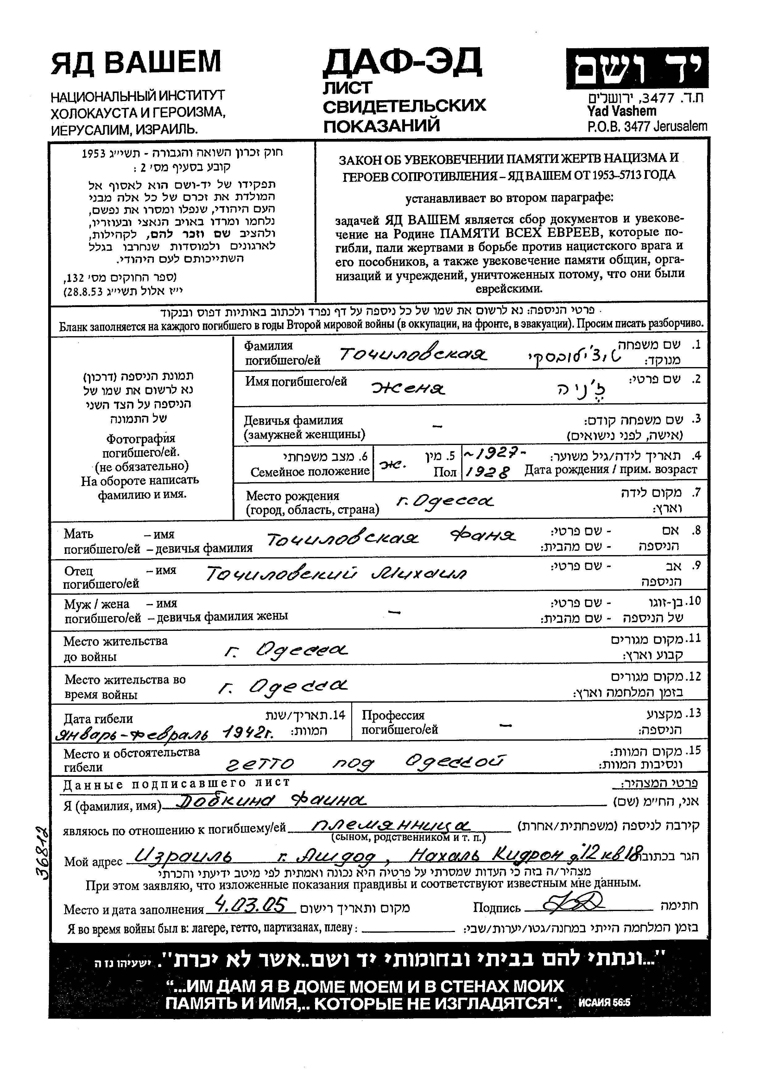 Tochilovskaya Zhenya 1927 Odessa, Ukraine (URSS) Feuille de témoignage