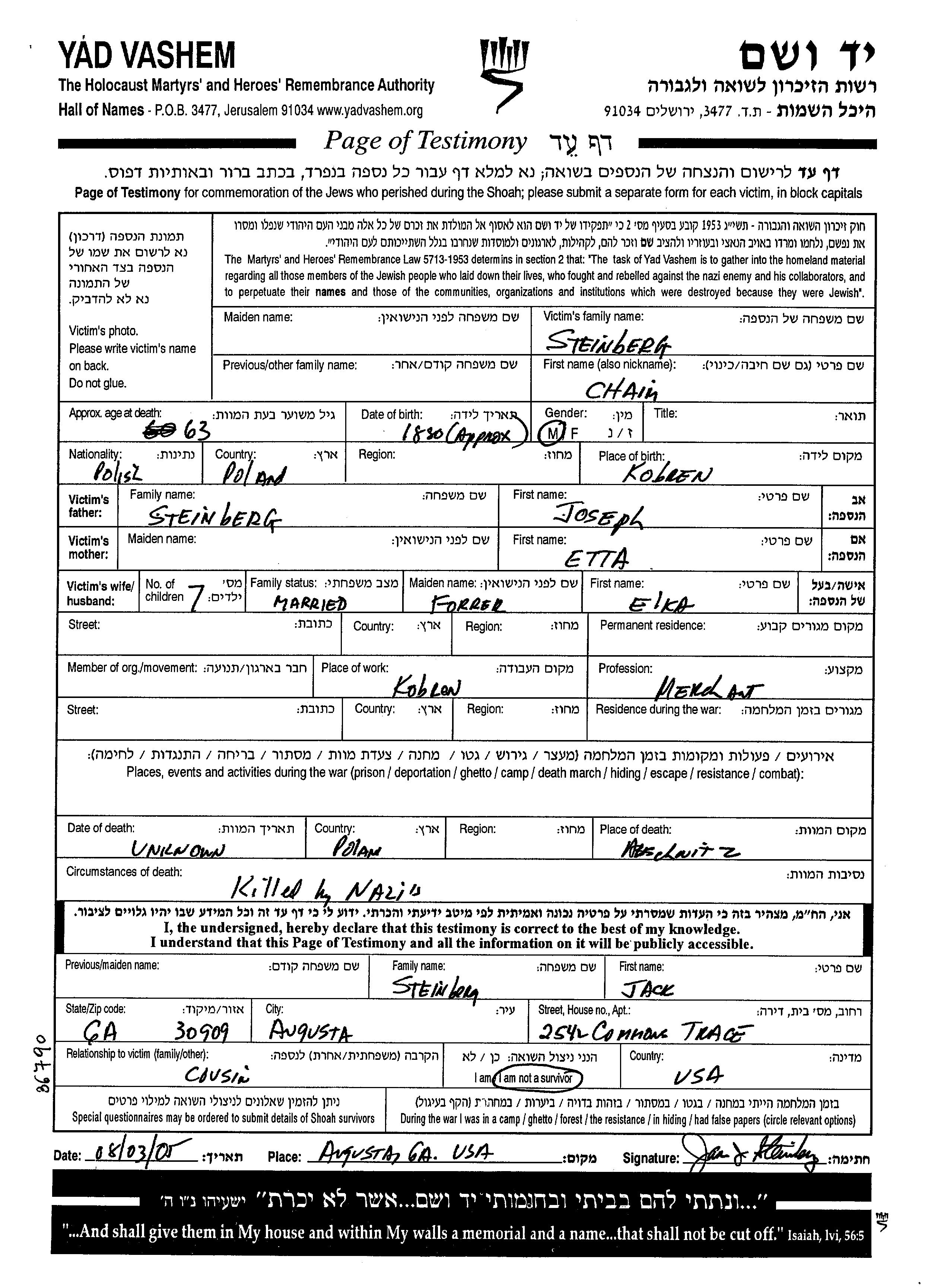 Steinberg Chaim 1880 endroit inconnu, Feuille de témoignage