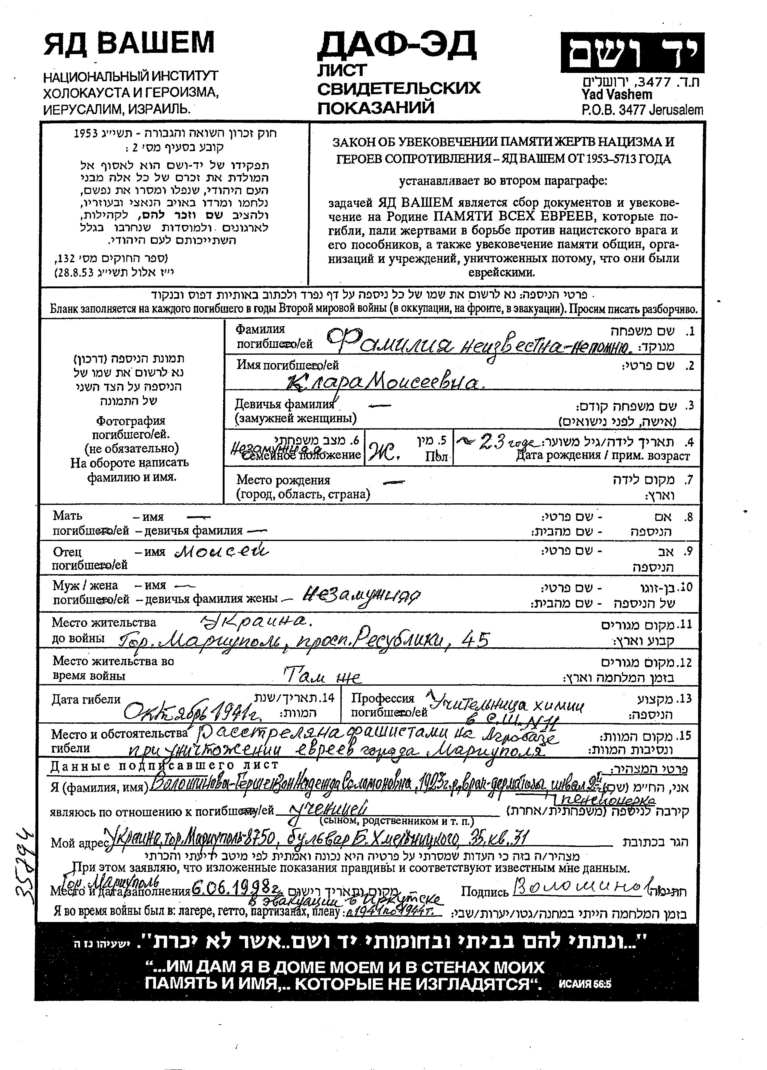 nom inconnu Klara Mariupol, Ukraine (URSS) Feuille de témoignage