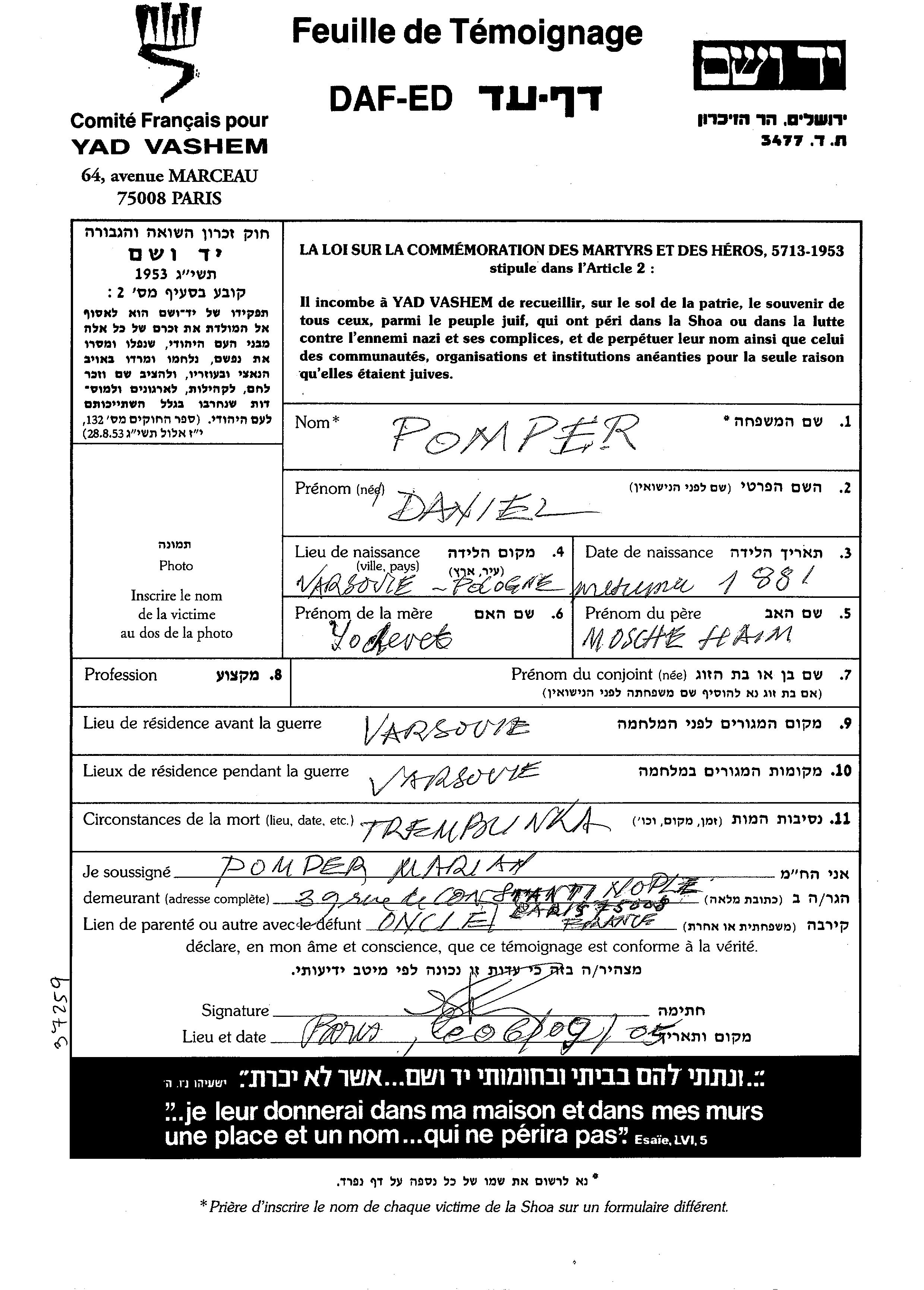 Daniel Pomper est né à Varsovie, Pologne en 1881, fils de Mosche Haim et de Yochevet. Avant la seconde guerre mondiale il vivait à Varsovie, Pologne. Au cours de la guerre, il était à Varsovie, Pologne.