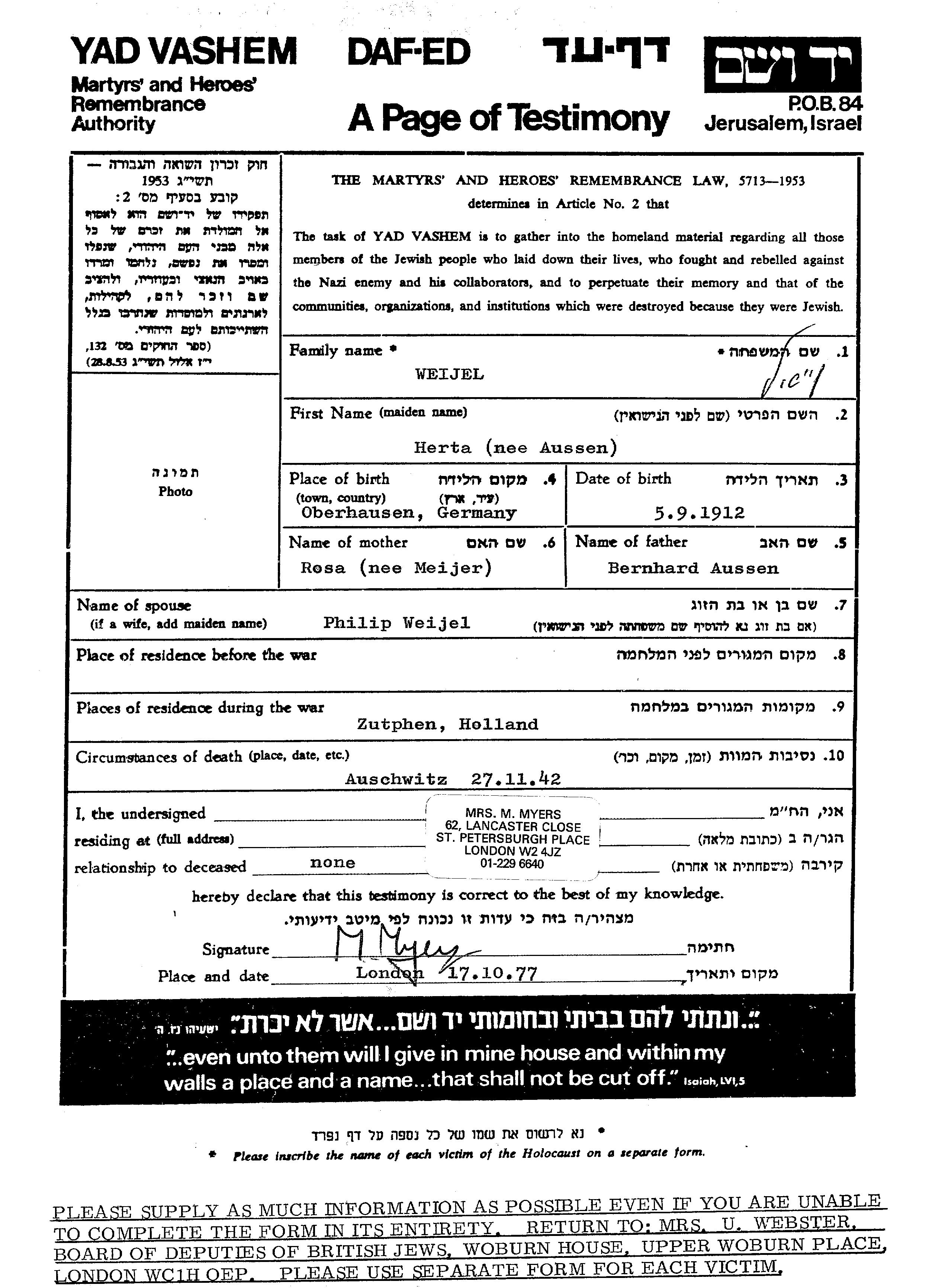 Herta Weijel née Aussen est née à Oberhausen, Allemagne en 1912, fille de Bernhard et de Rosa. Elle était Mariée à Philip. Pendant la guerre, elle était à Zutphen, Pays-Bas.