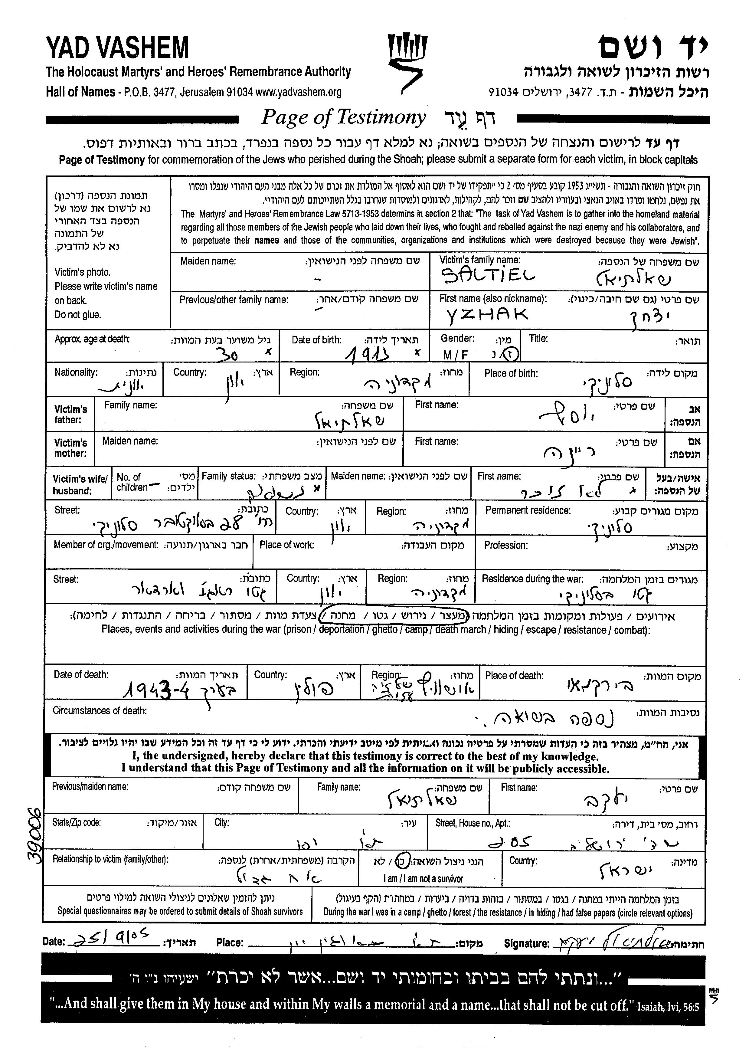 Shaltiel Yzhak 1913 Saloniki, Grèce Feuille de témoignage
