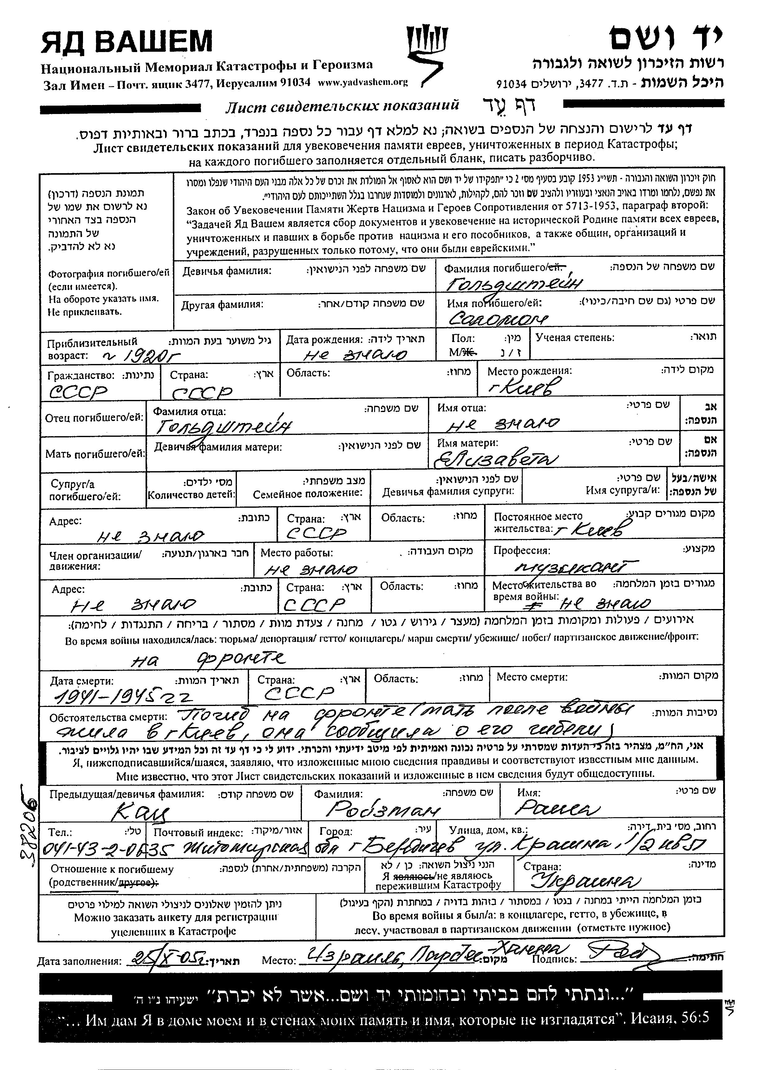 Solomon Goldshtein est né à Kiev, Ukraine (URSS) en 1920, fils de Yelizaveta. Il était Musicien/ne. Avant la seconde guerre mondiale il vivait à Kiev, Ukraine (URSS). Solomon a été tué en tant que militaire pendant la Seconde Guerre mondiale. Lieu de la mort: Union soviétique en 1941.