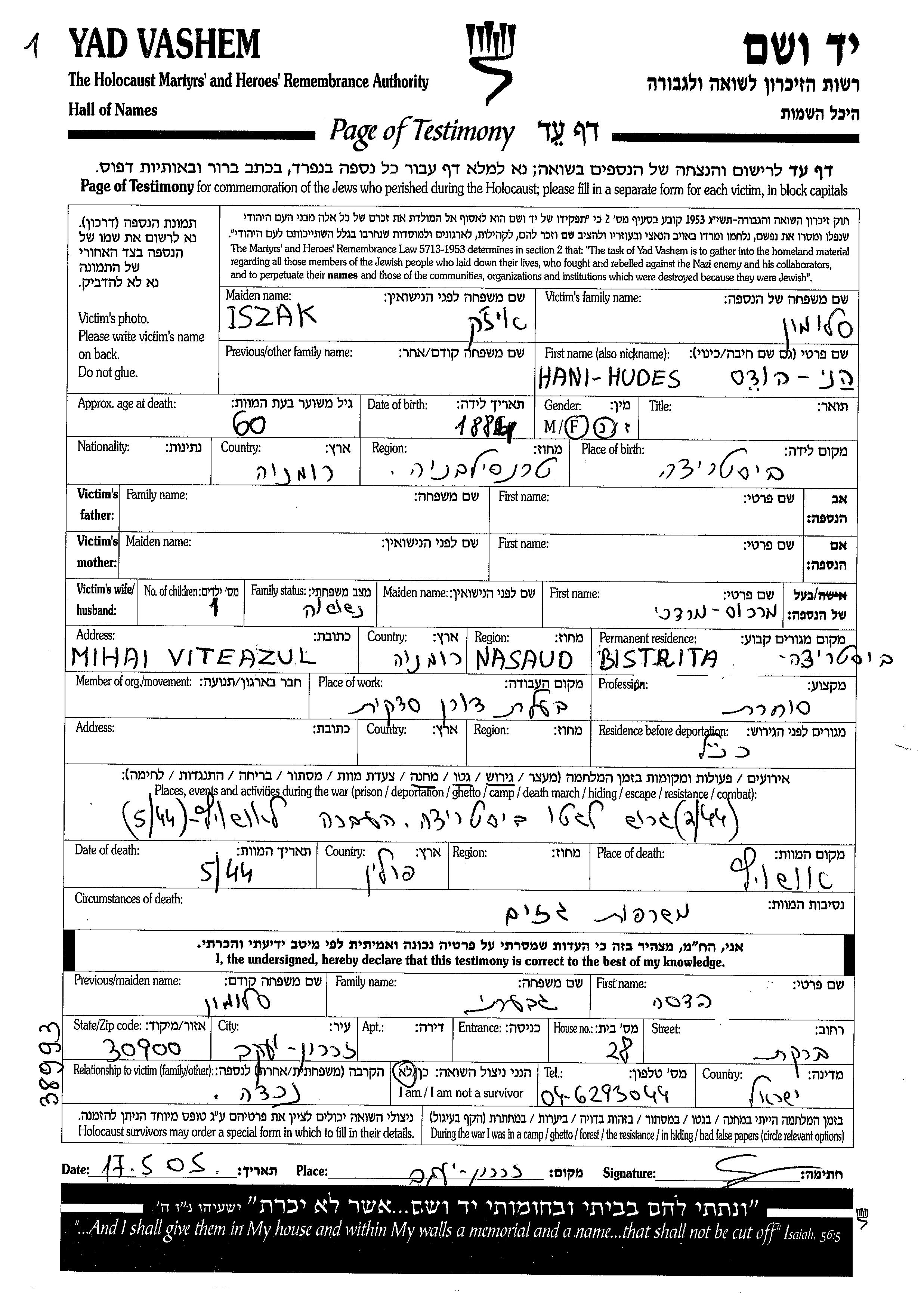 Yad Vashem - Pages of Testimony Names Memorial Collection