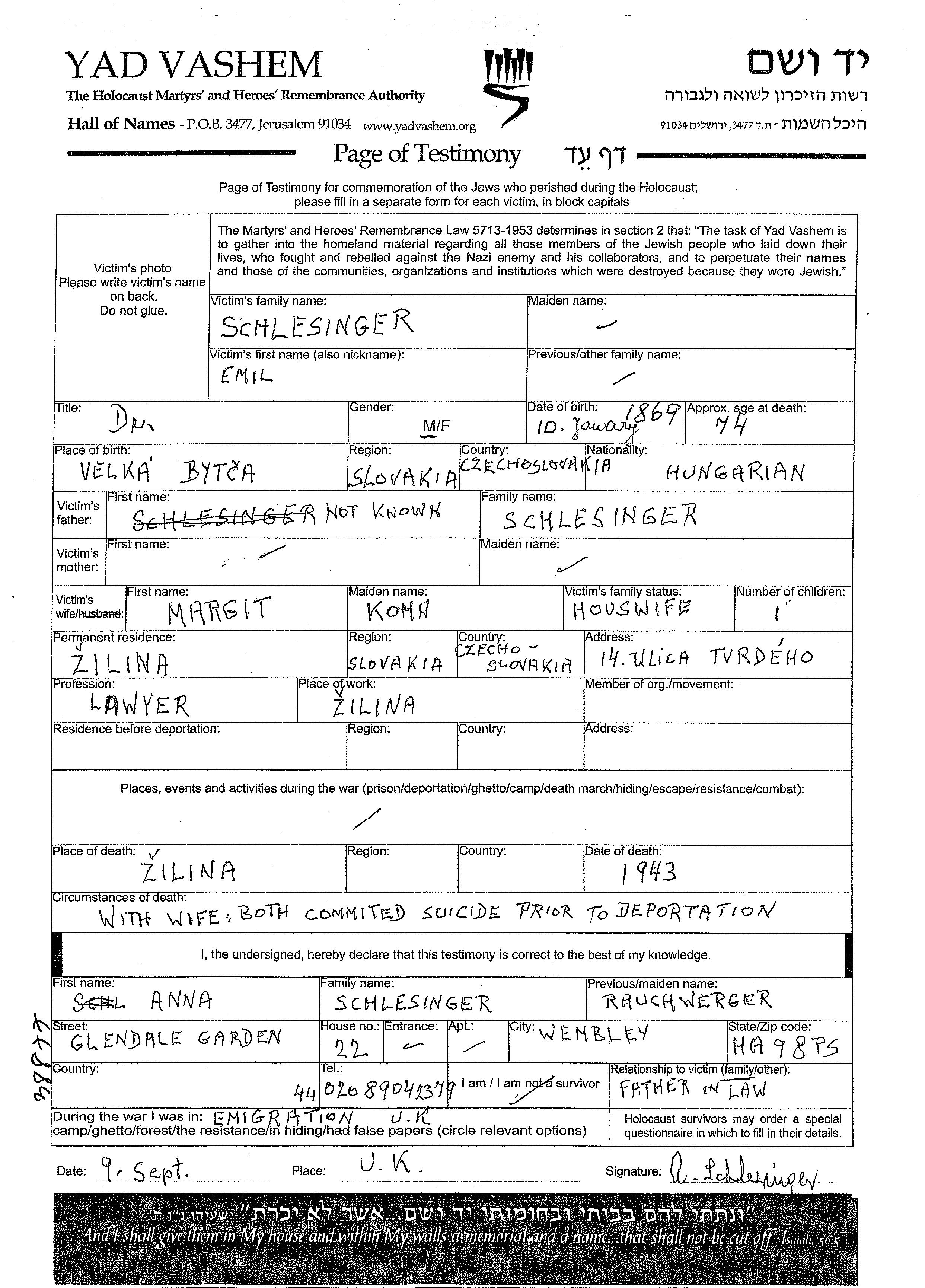 Dr. Schlesinger a été assassiné pendant la Shoah. Lieu de la mort: Zilina, Tchécoslovaquie en 1943.