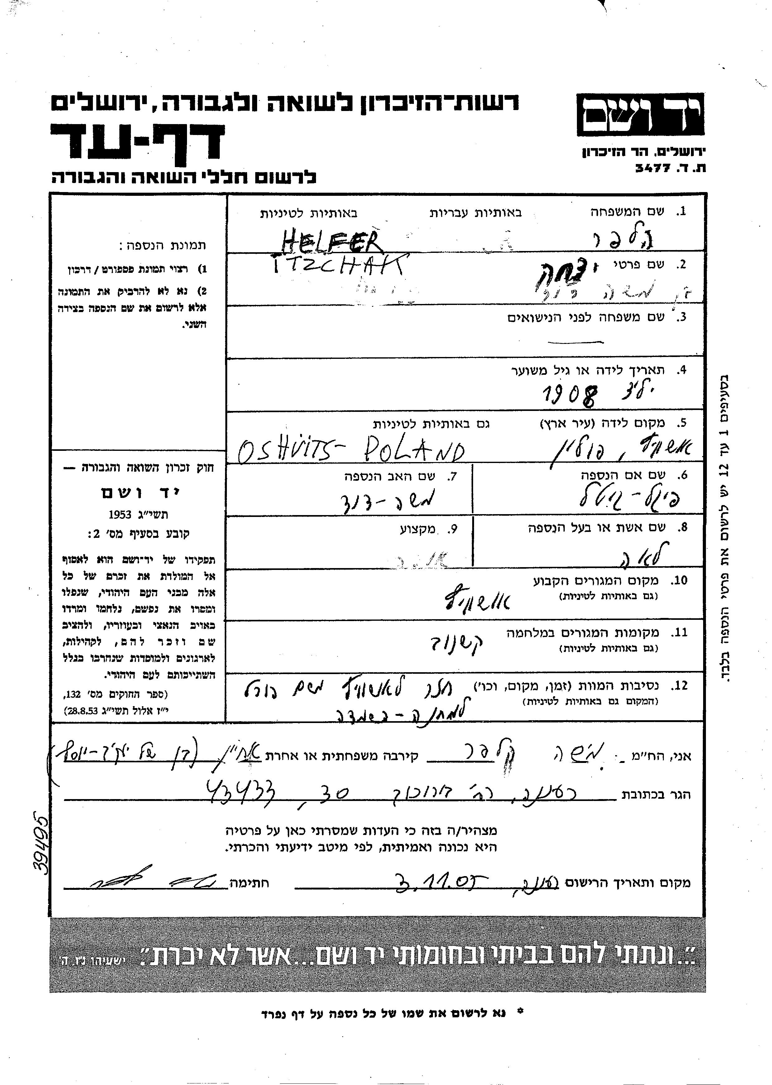 Helfer Itzchak 1908 Auschwitz, Pologne Feuille de témoignage