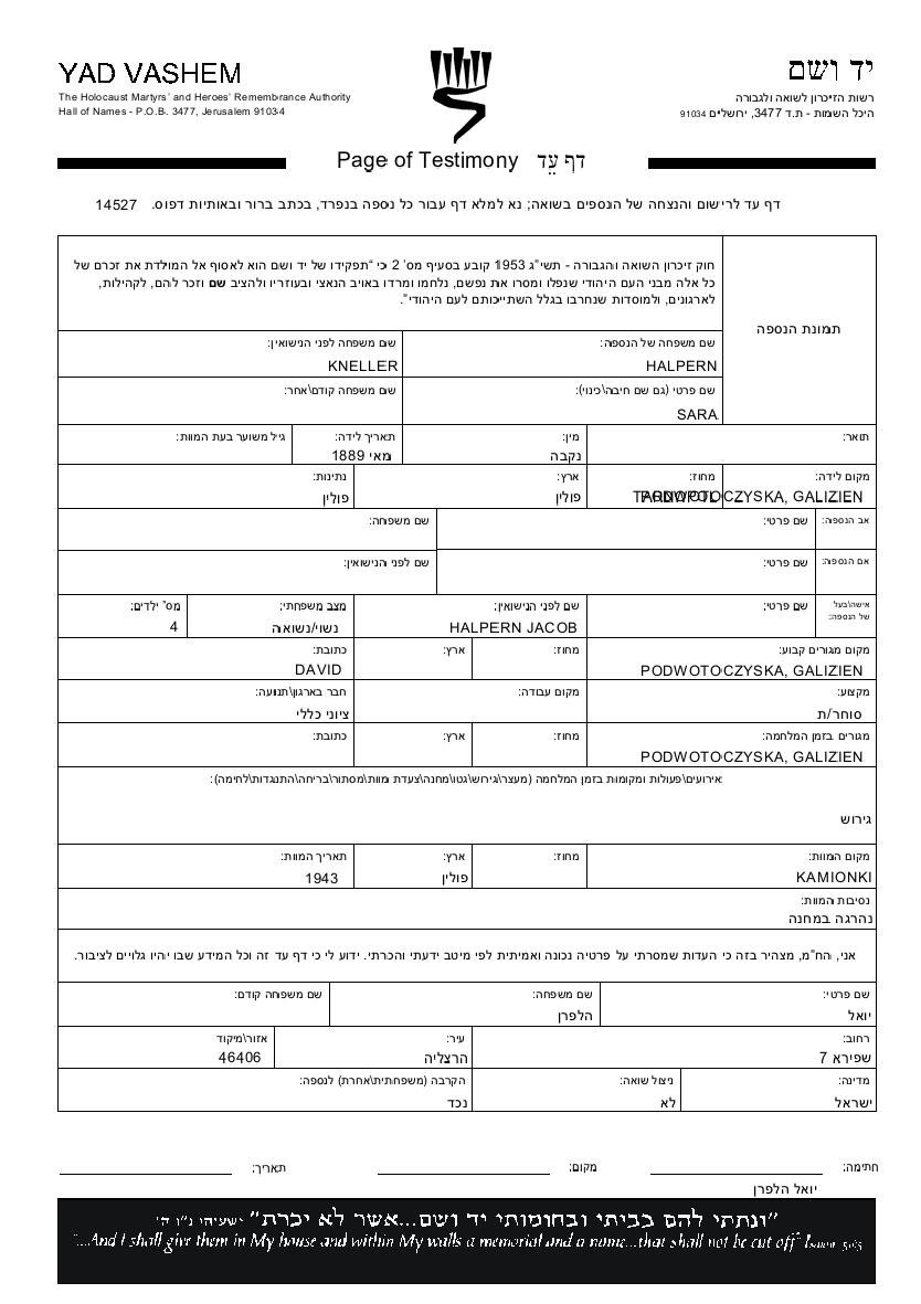 Halpern Sara 1889 Podwoloczyska, Pologne Feuille de témoignage (digitale)
