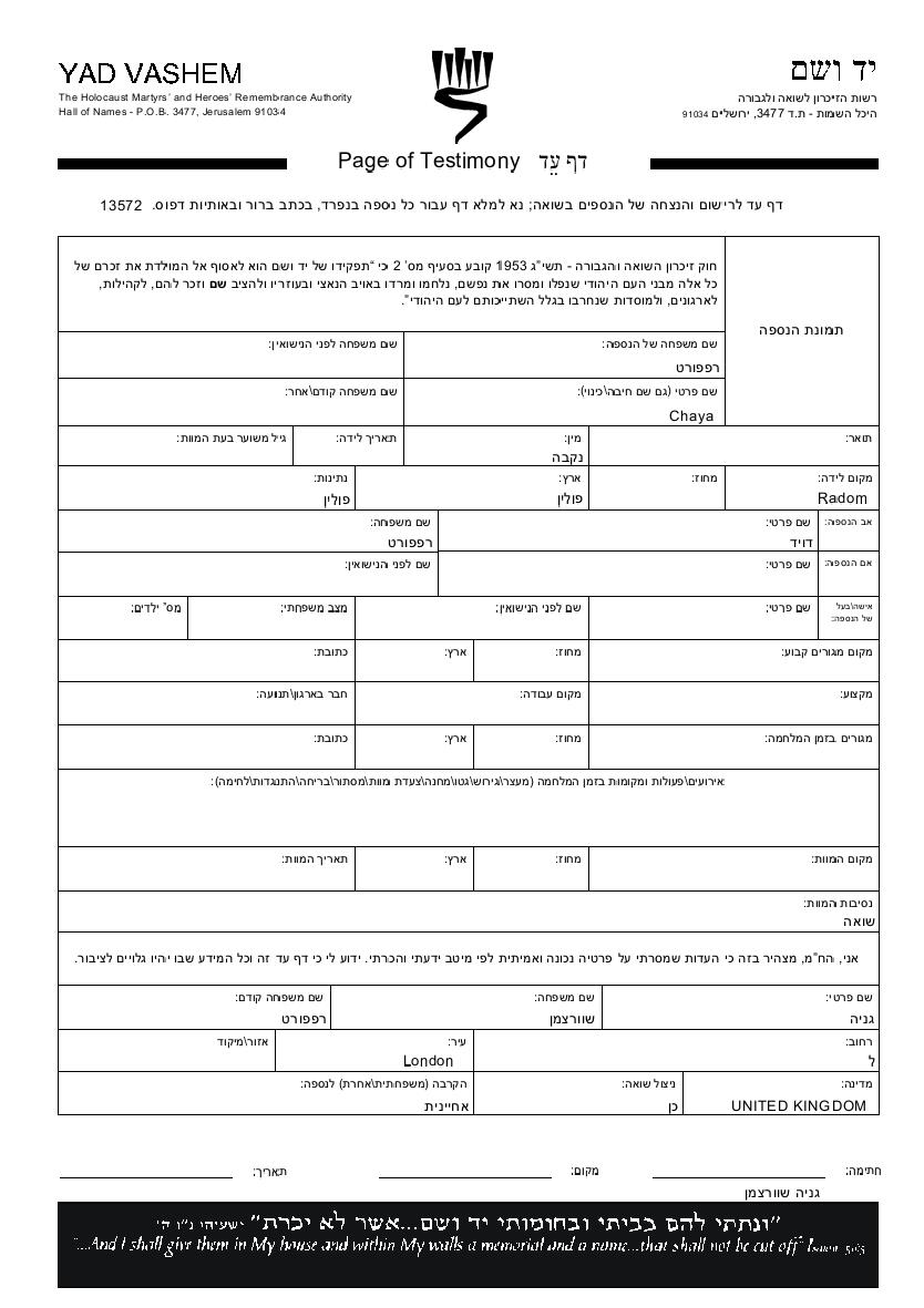 Rapaport Chaya endroit inconnu, Feuille de témoignage (digitale)